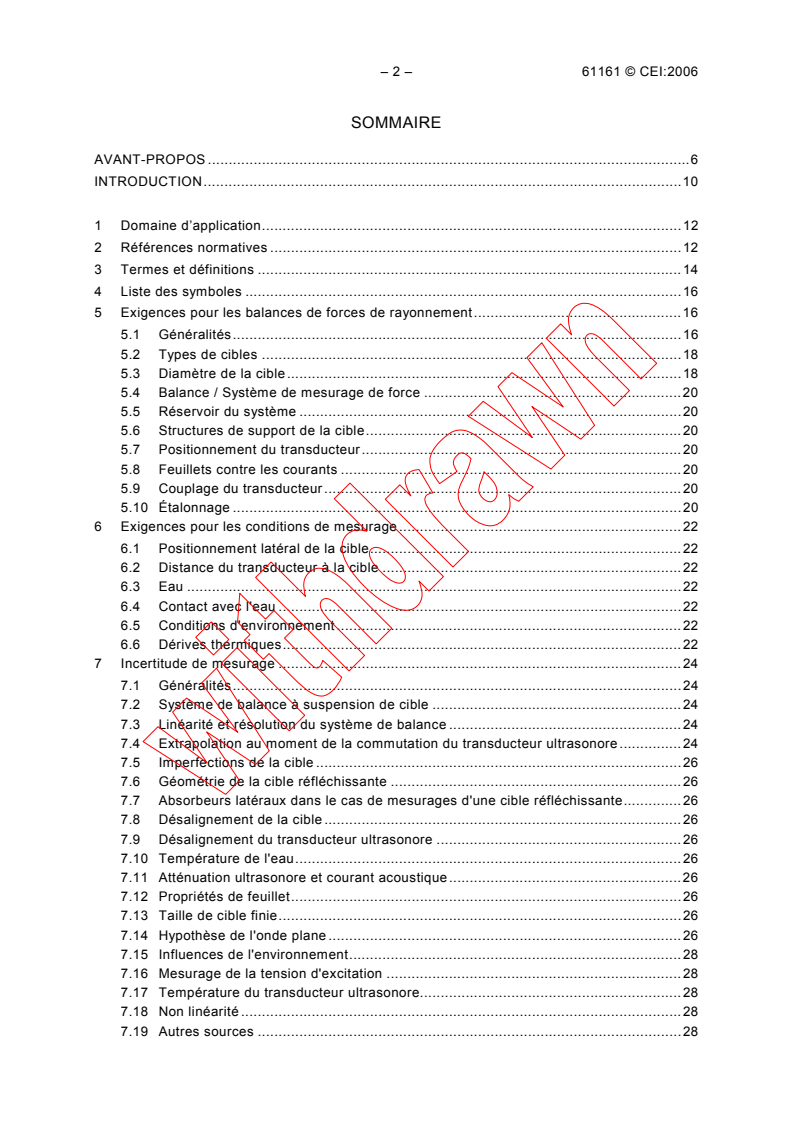 IEC 61161:2006 is an international standard developed by the International Electrotechnical Commission (IEC), focused on ultrasonics power measurement. This standard specifies methods and performance requirements for radiation force balances used to determine the total acoustic power emitted by ultrasonic transducers. It serves as a guideline for accurate and reliable measurement of ultrasonic power, which is critical for applications across medical, industrial, and research environments.