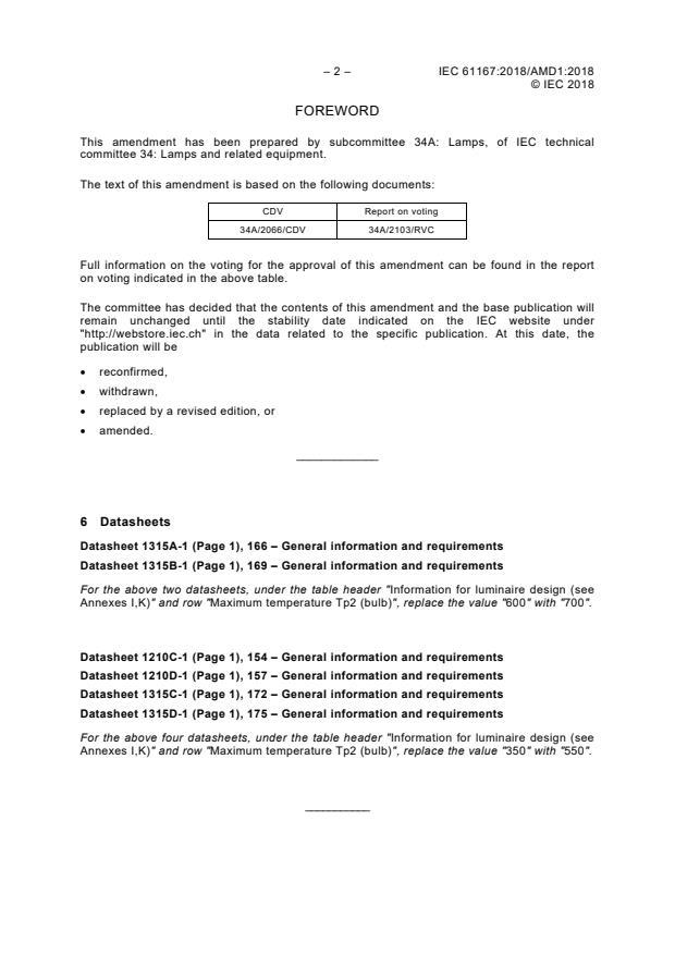 IEC 61167:2018/AMD1:2018 is a standard published by the International Electrotechnical Commission (IEC). Its full title is "Amendment 1 - Metal halide lamps - Performance specification". This standard covers: Amendment 1 - Metal halide lamps - Performance specification