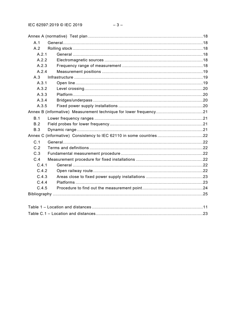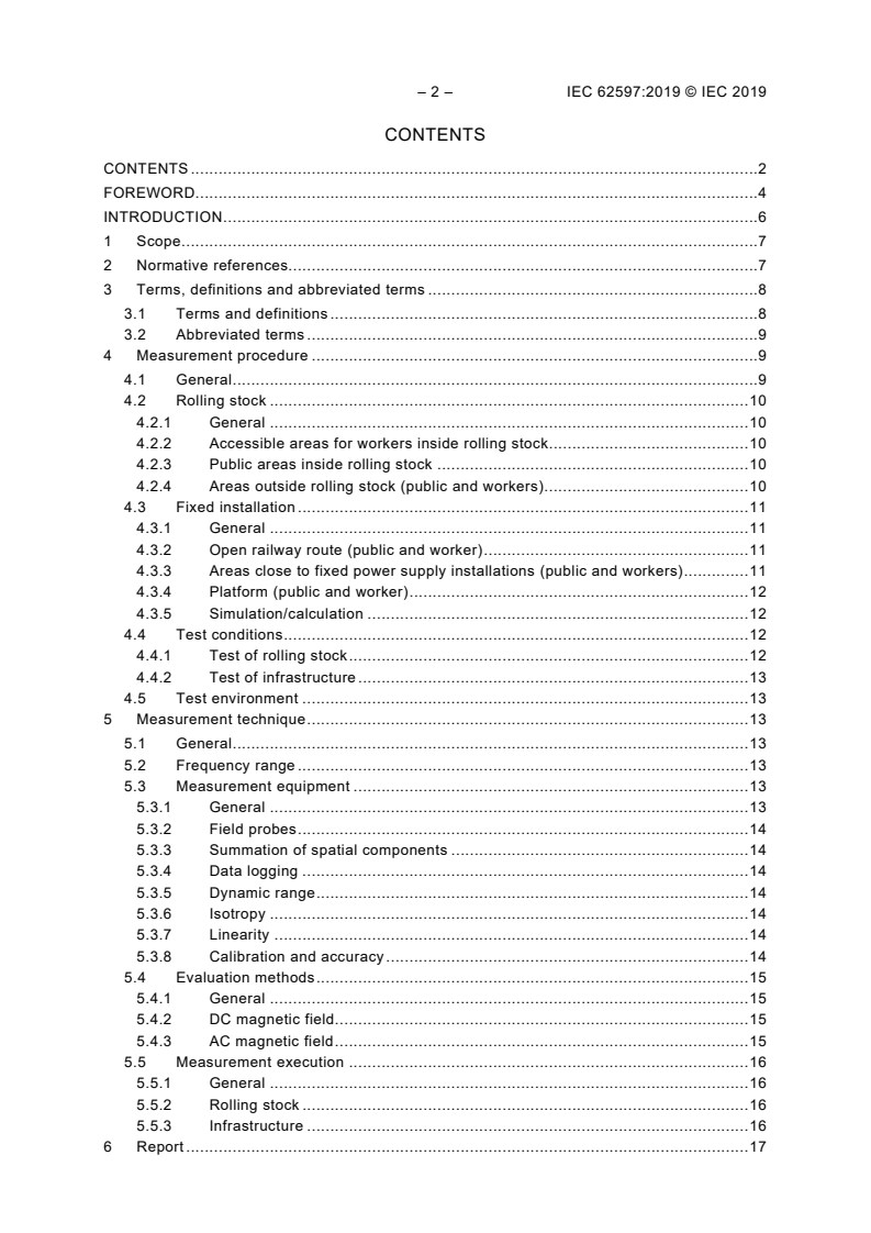 IEC 62597:2019 is a standard published by the International Electrotechnical Commission (IEC). Its full title is "Magnetic field levels generated by electronic and electrical apparatus in the railway environment with respect to human exposure - Measurement procedures". This standard covers: IEC 62597:2019 is limited to apparatus, systems and fixed installations which are intended for use in the railway environment. The frequency range covered is 0 Hz to 300 GHz. Technical considerations and measurements are specified for frequencies up to 20 kHz because no relevant field strengths are expected above due to the physical nature of EMF‑sources in the railway environment. The object of this document is to provide measurement and calculation procedures of electric and magnetic field levels generated by electronic and electrical apparatus in the railway environment with respect to human exposure. The regulations regarding the protection of human beings during exposure to non-ionizing electromagnetic fields in the railway environment are different within the countries worldwide. This document offers a procedure regarding measurement, simulation/calculation and evaluation. The measurement procedures and points of measurement cover also the aspect of persons bearing active implantable medical devices. This document does not apply to the risk assessment for persons bearing active implants in magnetic field generated by electronic and electrical apparatus in the railway environment. This first edition cancels and replaces IEC TS 62597 published in 2011. This edition includes the following significant technical changes with respect to the Technical Specification: a) Clause 3.1: The extent of “Terms and definitions” has been updated b) Clause 3 was expanded by clause 3.2 “abbreviated terms” c) Clause 4.2: The “surface method” for Rolling Stock measuement was deleted. Mandatory measurement method is former “volume method” with slightly modified measurement heghts. d) Clause 4.3: Japanese set of measurement heghts for fixed installations was deleted. e) Clause 5.2 and new Annex B: Measurement technique for lower frequency range up to 5 Hz. f) New Annex C: Consistency to IEC 62110 in some countries g) Several editorial improvements have been included in the entire document