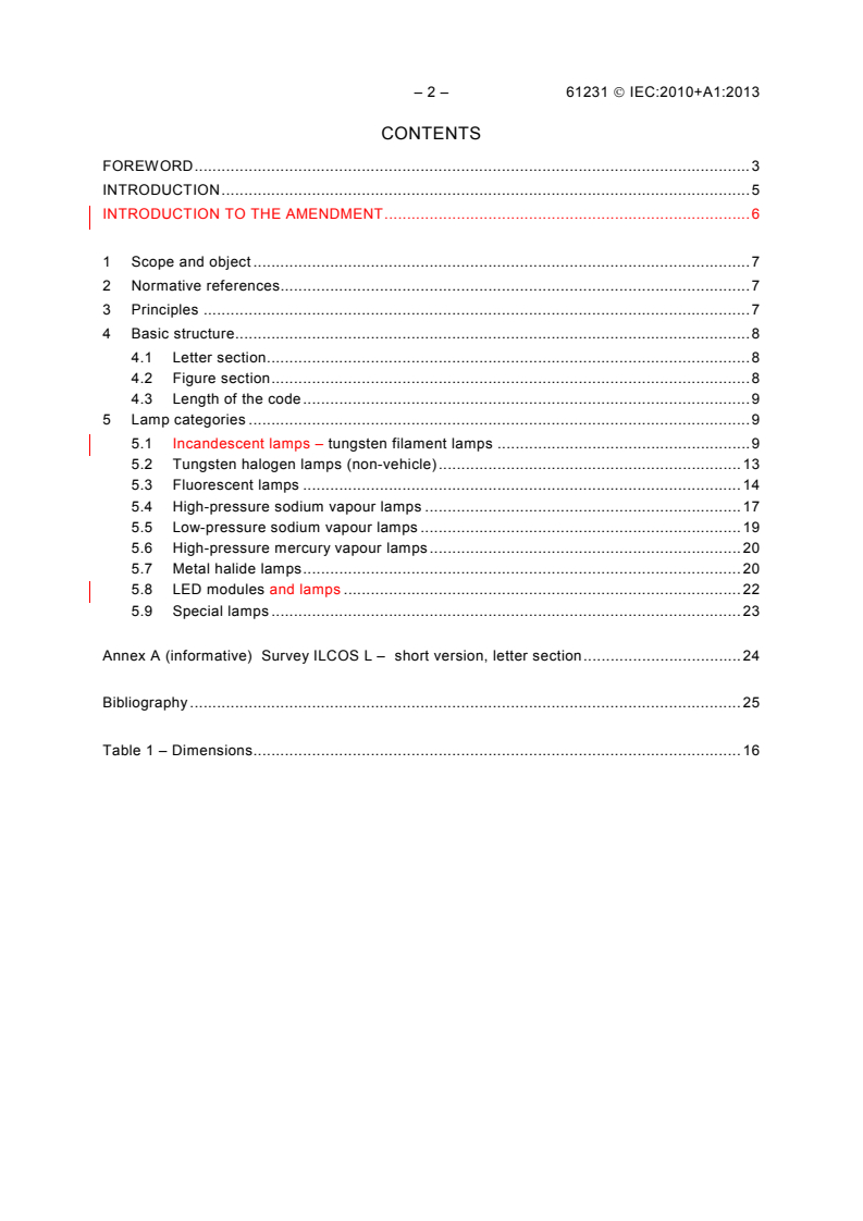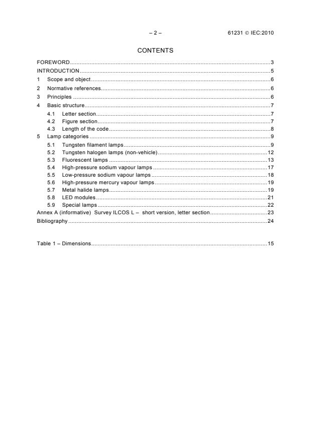 La CEI 61231:2010 détaille les règles du système international de codification des lampes et couvre toutes les catégories de lampes, à l'exception des lampes pour véhicules. La codification des principaux types de lampes y est spécifiée; celle des autres types suivra, sous la forme d'amendements à cette norme. Cette première édition annule et remplace la deuxième édition de la CEI 61231, publiée comme spécification technique. Elle constitue une révision technique, dont les principales modifications sont indiquées ci-dessous: - introduction des DEL (Paragraphe 5.8).