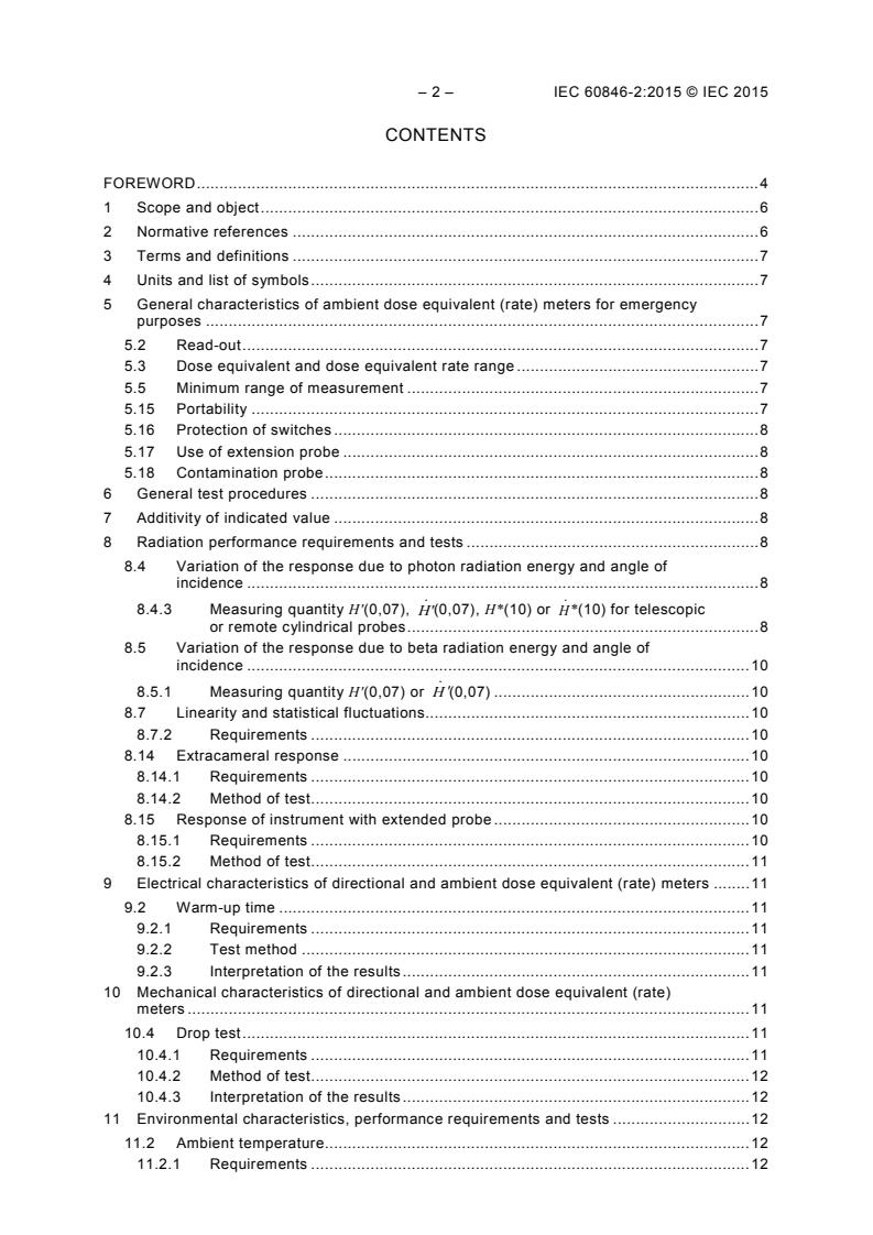 IEC 60846-2:2015 is an international standard developed by the International Electrotechnical Commission (IEC) that specifies the requirements for portable and transportable high range dose equivalent (rate) meters and monitors. These instruments are designed to measure ambient and directional dose equivalent from external beta, X, and gamma radiation up to energies of 10 MeV, specifically for emergency radiation protection purposes. The standard focuses on the design, performance, test methods, and documentation necessary to ensure accurate and reliable monitoring during radiological emergencies.