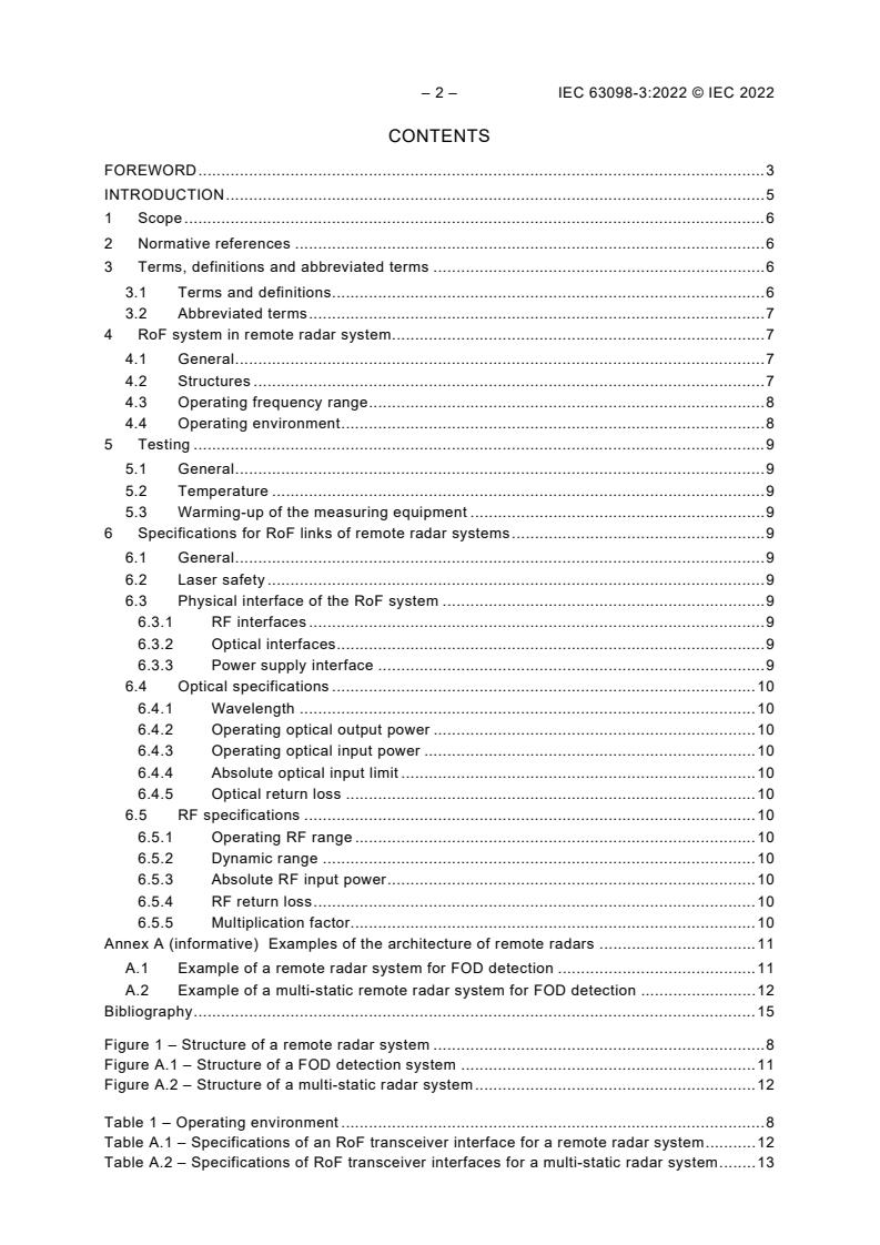 IEC 63098-3:2022 is an international standard published by the International Electrotechnical Commission (IEC) focusing on radio-over-fibre (RoF) technologies applied to remote radar systems for foreign object debris (FOD) detection. This standard defines the technical specifications and performance requirements of RoF interfaces used to connect a central station (CS) with remote radar heads (RRHs). The goal is to ensure vendor compatibility and reliable operation of RoF-based radar systems designed for FOD detection, particularly important in environments such as runways where safety is critical.