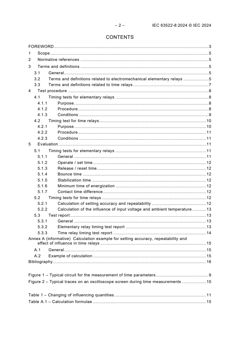 This standard is used for timing tests on electrical relays and related devices when specified. It defines procedures to verify that timing parameters such as operate time, release time, bounce time, stabilization time, and minimum energization time meet design requirements.Terminology and Definitions