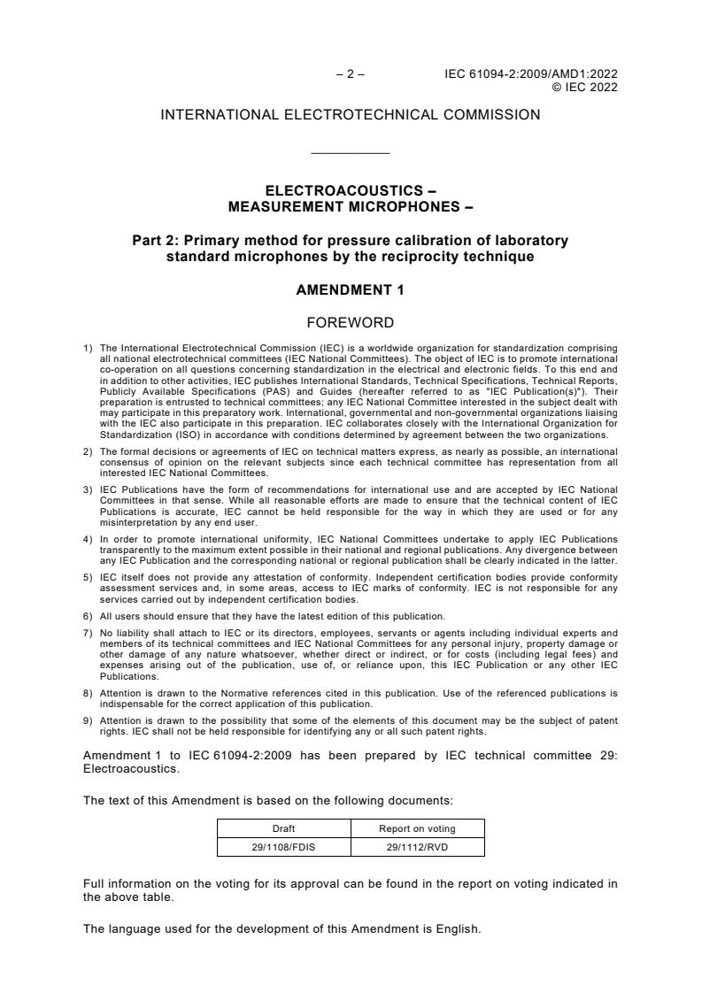 Keywords: IEC 61094-2 amendment, reciprocity technique calibration, measurement microphones, pressure calibration, laboratory standard microphones, electroacoustics, microphone acoustic impedance, heat conduction correction, microphone leakage, microphone calibration uncertainty, international calibration standards.