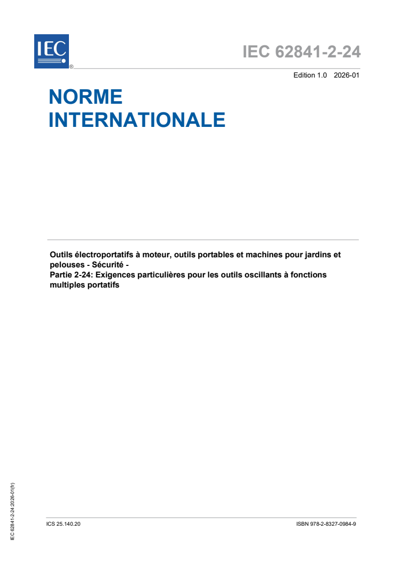 IEC 62841-2-24:2026 - Outils électroportatifs à moteur, outils portables et machines pour jardins et pelouses - Sécurité - Partie 2-24: Exigences particulières pour les outils oscillants à fonctions multiples portatifs Released:27. 01. 2026 Isbn:9782832709849