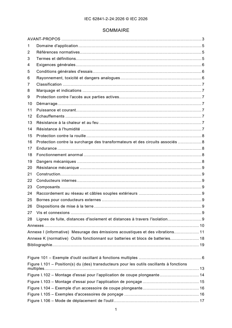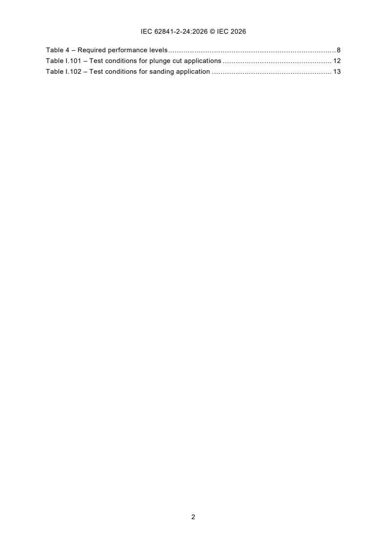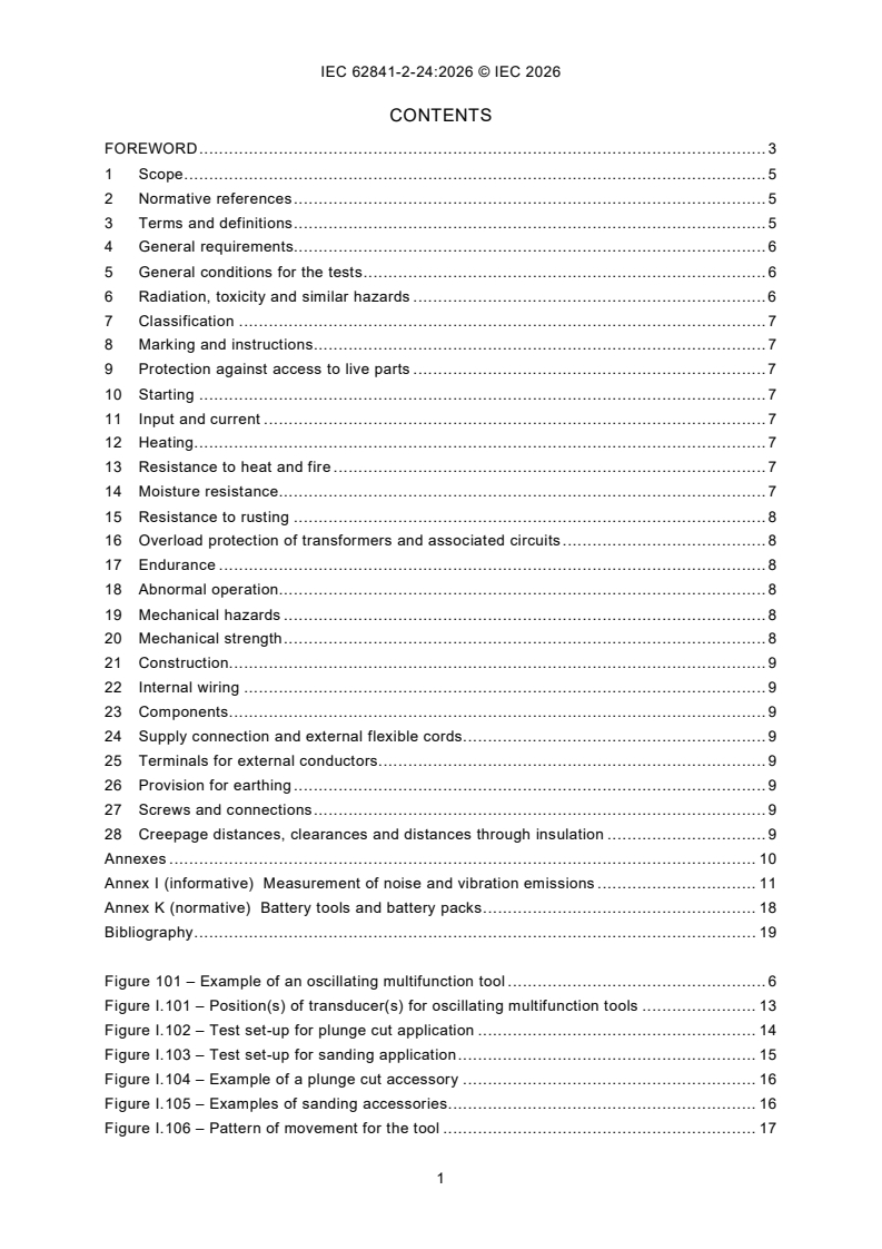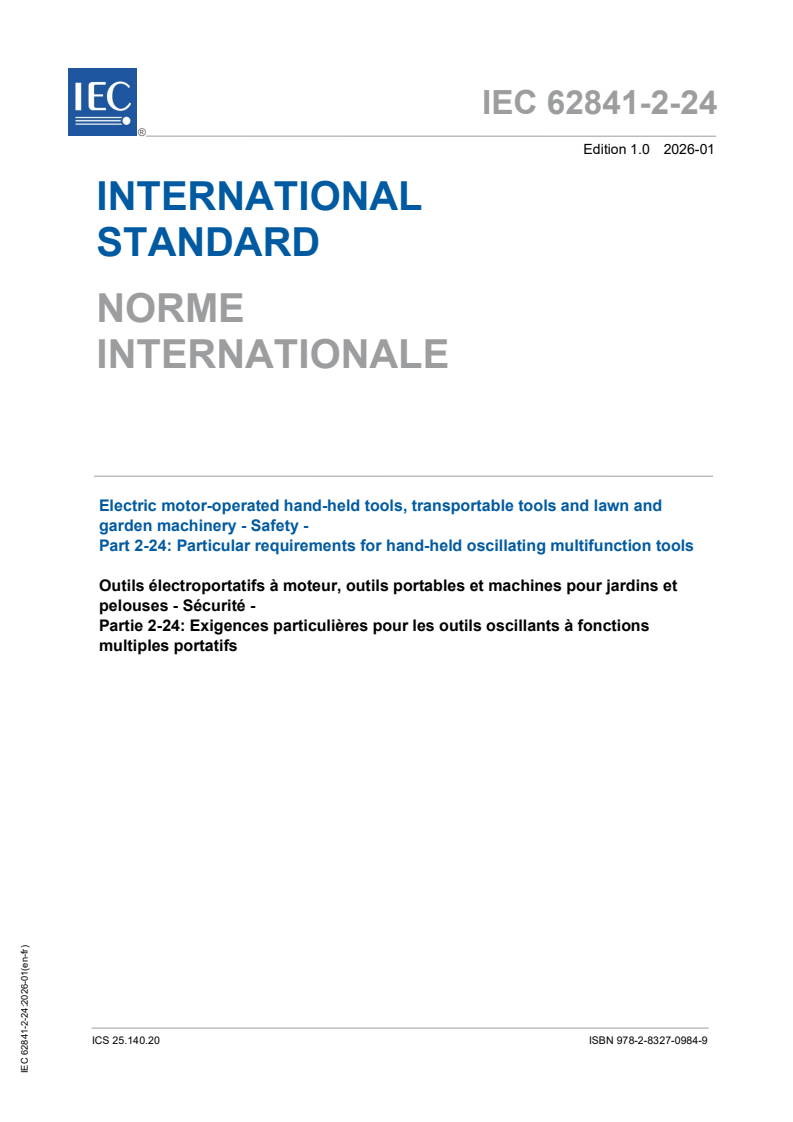 IEC 62841-2-24:2026 is a standard published by the International Electrotechnical Commission (IEC). Its full title is "Electric motor-operated hand-held tools, transportable tools and lawn and garden machinery - Safety - Part 2-24: Particular requirements for hand-held oscillating multifunction tools". This standard covers: IEC 62841-2-24:2026 applies to oscillating multifunction tools. This document is to be used in conjunction with IEC 62841-1:2014 and IEC 62841-1:2014/AMD1:2025. This document supplements or modifies the corresponding clauses in IEC 62841-1, so as to convert it into the IEC Standard: Particular requirements for hand-held oscillating multifunction tools. Where a particular subclause of IEC 62841-1 is not mentioned in this document, that subclause applies as far as reasonable. Where this document states "addition", "modification" or "replacement", the relevant text in IEC 62841-1 is to be adapted accordingly. The attention of National Committees is drawn to the fact that equipment manufacturers and testing organizations may need a transitional period following publication of a new, amended or revised IEC publication in which to make products in accordance with the new requirements and to equip themselves for conducting new or revised tests. It is the recommendation of the committee that the content of this publication be adopted for implementation nationally not earlier than 36 months from the date of publication.
