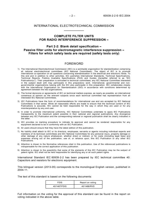 Keywords: IEC 60939-2-2, complete filter units, radio interference suppression, passive filter units, electromagnetic interference suppression, safety tests, blank detail specification, conformance tests, requalification.