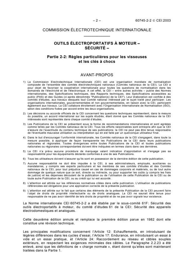 IEC 60745-2-2:2003 is an international safety standard published by the International Electrotechnical Commission (IEC) specifically addressing hand-held motor-operated electric tools. This part 2-2 standard defines the particular safety requirements for screwdrivers and impact wrenches. It applies to tools operating at rated voltages of up to 250 V for single-phase AC or DC, and up to 440 V for three-phase AC tools.