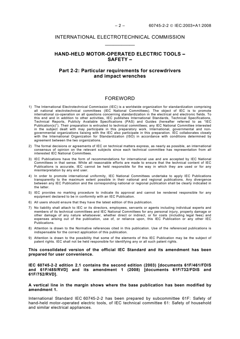 IEC 60745-2-2:2003+AMD1:2008 CSV - Hand-held motor-operated electric tools - Safety - Part 2-2: Particular requirements for screwdrivers and impact wrenches Released:17. 07. 2008