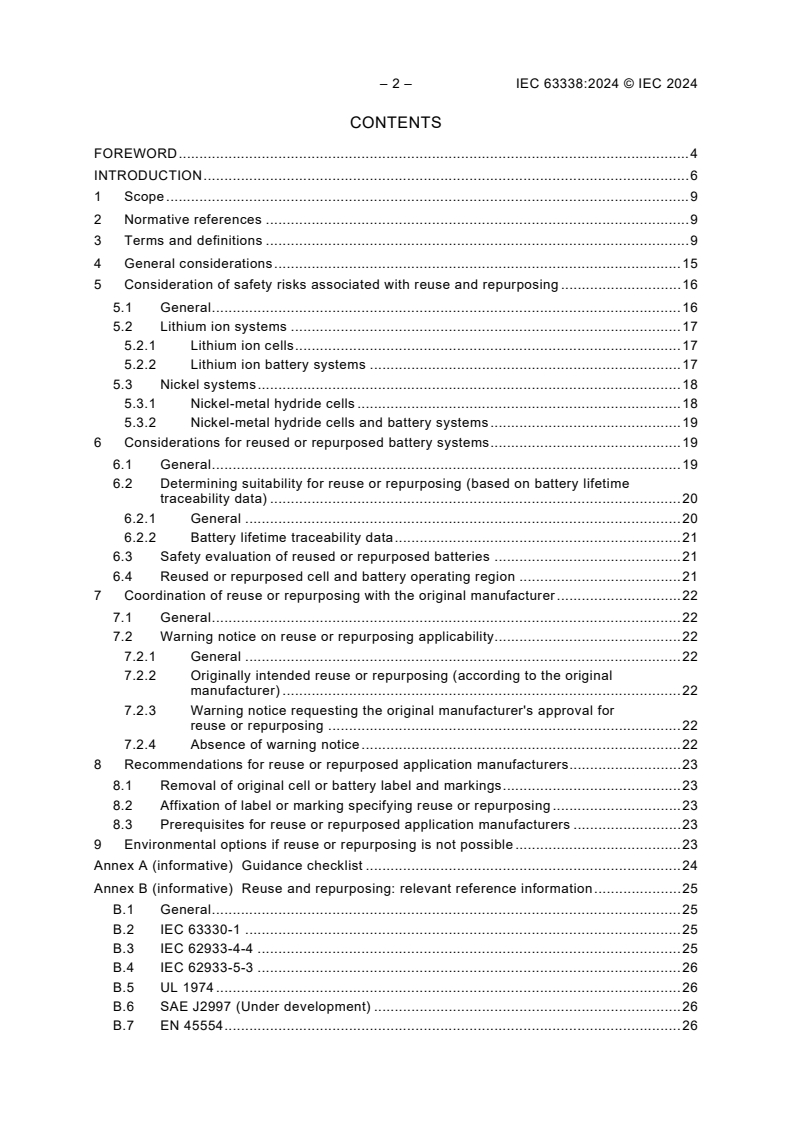 IEC 63338:2024 is a standard published by the International Electrotechnical Commission (IEC). Its full title is "General guidance on reuse and repurposing of secondary cells and batteries". This standard covers: IEC 63338:2024 applies to the reuse and repurposing of secondary lithium ion and nickel-metal hydride cells and batteries after extraction from the application for which they were first placed on the market (hereafter "relevant cells and batteries"). This document does not permit reuse or repurposing of single cells or cell assemblies if battery lifetime traceability data are not recorded. See Clause 4. Swappable batteries such as those used in e-scooters are removed and installed by the user (such as for charging) without conducting a safety assessment (such as battery lifetime traceability data assessment) as part of intended use, which is not considered reuse or repurposing. This document does not cover system component reuse and repurposing. The original manufacturer can be contacted to confirm suitability of components for reuse and repurposing. The primary purpose of this document is to provide basic guidance on the environmental aspects of reuse and repurposing of relevant cells and batteries; basic guidance on safety risks for the reuse and repurposing of relevant cells and batteries; basic guidance on original manufacturer warning notice on the applicability of a product for reuse or repurposing; and useful information regarding reuse and repurposing and relevant cell and battery regulations and standards to interested parties.