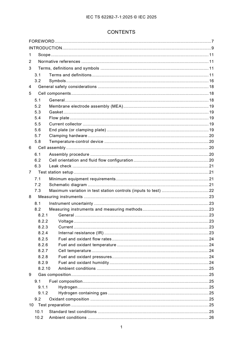 IEC TS 62282-7-1:2025 covers cell assemblies, test station setup, measuring instruments and measuring methods, performance test methods, and test reports for PEFC single cells.
