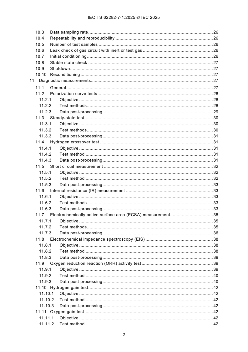 IEC TS 62282-7-1:2025 is a technical specification published by the International Electrotechnical Commission (IEC). Its full title is "Fuel cell technologies - Part 7-1: Test methods - Single cell performance tests for polymer electrolyte fuel cells (PEFC)". This standard covers: IEC TS 62282-7-1:2025 covers cell assemblies, test station setup, measuring instruments and measuring methods, performance test methods, and test reports for PEFC single cells. This document is used for evaluating: a) the performance and durability of membrane electrode assemblies (MEAs) for PEFCs in a single cell configuration; b) materials or structures of PEFCs in a single cell configuration; or, c) the influence of impurities in fuel and/or in air on the fuel cell performance and durability. This document is for proton exchange membrane fuel cells (PEMFC) basically having flow field configurations and using hydrogen or hydrogen containing gas as fuel. It excludes from the scope fuel cells based on anion exchange membranes, bipolar membranes, and phosphoric acid doped polybenzimidazole membranes.
