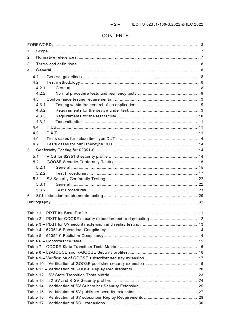 IEC TS 62351-100-6:2022 (E), which is a technical specification, is part of the IEC 62351 suite of standards, which describes test cases for interoperability conformance testing of data and communication security for Substation Automation Systems [SAS] and telecontrol systems which implement IEC TS 62351-6. The tests described in this part do not evaluate the security of the implementation. Thus, citing conformance to this part does not imply that any particular security level has been achieved by the corresponding product, or by the system in which it is used. The goal of this part of IEC 62351 is to enable interoperability by providing a standard method of testing protocol implementations, but it does not guarantee the full interoperability of devices. It is expected that using this specification during testing will minimize the risk of non-interoperability. Additional testing and assurance measures will be required to verify that a particular implementation of IEC TC 62351-6 has correctly implemented all the security functions and that they can be assured to be present in all delivered products. This topic is covered in other IEC standards, for example IEC 62443. The scope of this document is to specify common available procedures and definitions for conformance and/or interoperability testing of IEC 62351-6, the IEC 61850-8-1, IEC 61850-9-2 and also their recommendations over IEC 62351-3 for profiles including TCP/IP and IEC 62351 4 for profiles including MMS. These are the security extensions for IEC 61850 and derivatives to enable unambiguous and standardized evaluation of IEC TS 62351-6 and its companion standards protocol implementations. The detailed test cases per companion standard, containing among others mandatory and optional mandatory test cases per Secure Communication Application Function, secure ASDU (Application Service Data Unit) and transmission procedures, will become available as technical specifications (TS). Other functionality may need additional test cases, but this is outside the scope of this part of IEC 62351. This document is such a technical specification for the mentioned companion standard. This document deals mainly with data and communication security conformance testing; therefore, other requirements, such as safety or EMC (Electromagnetic compatibility) are not covered. These requirements are covered by other standards (if applicable) and the proof of compliance for these topics is done according to these standards.