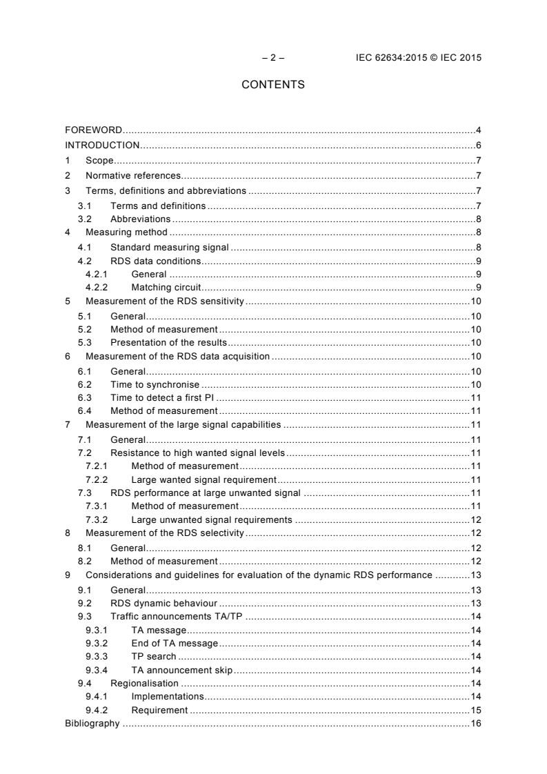 L'IEC 62634:2015 décrit les exigences minimales de performance des récepteurs RDS, qui concernent trois catégories de récepteurs RDS et leur mesure. Il convient néanmoins de noter qu'il existe aussi sur le marché des récepteurs RDS qui dépassent largement les exigences minimales de performances indiquées ici pour les récepteurs RDS. Cette deuxième édition annule et remplace la première édition publiée en 2011. Elle constitue une révision technique. Elle inclut les modifications suivantes:
