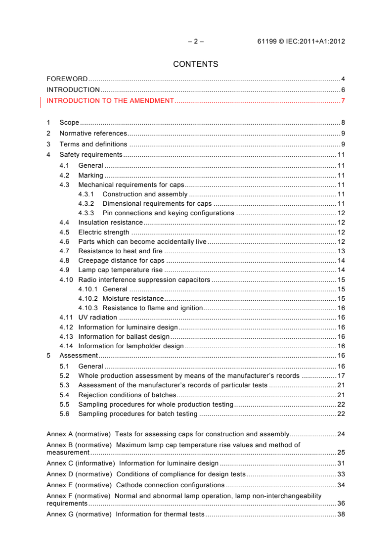 IEC 61199:2011 is an international standard developed by the International Electrotechnical Commission (IEC) that defines safety specifications for single-capped fluorescent lamps used in general lighting. This standard applies to all groups of such lamps with caps as categorized in IEC 60061. It outlines the safety requirements manufacturers must follow to ensure product safety and compliance, including testing methods for whole production appraisal and batch assessments. The third edition, published in 2011 with subsequent amendments in 2012 and 2014, introduces important updates such as requirements for high-frequency operation, new temperature measurement points, and updated cap-holder configurations.