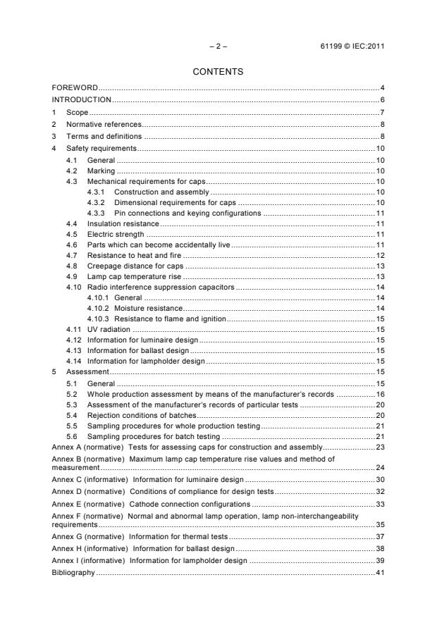 IEC 61199:2011 is a standard published by the International Electrotechnical Commission (IEC). Its full title is "Single-capped fluorescent lamps - Safety specifications". This standard covers: IEC 61199:2011 specifies the safety requirements for single-capped fluorescent lamps for general lighting purposes of all groups havingcaps according to Table 1. It also specifies the method a manufacturer should use to show compliance with the requirements of this standard on the basis of whole production appraisal in association with his test records on finished products. This method can also be applied for certification purposes. Details of a batch test procedure which can be used to make limited assessment of batches are also given in this standard. This third edition cancels and replaces the second edition published in 1999. It constitutes a technical revision. Main technical changes are the introduction of requirements for high frequency operation, a new temperature measurement position and few new cap-holder fits.