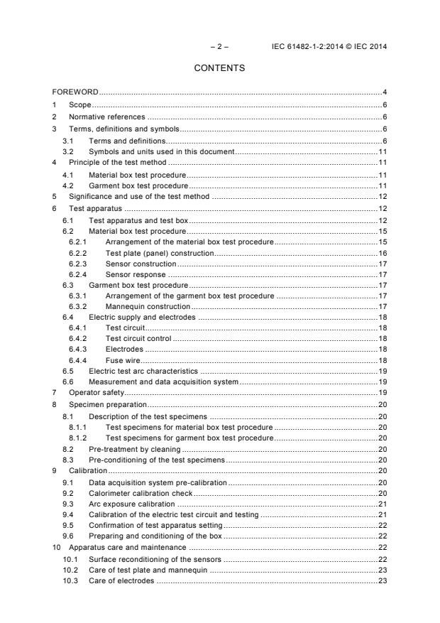 IEC 61482-1-2:2014 is a standard published by the International Electrotechnical Commission (IEC). Its full title is "Live working - Protective clothing against the thermal hazards of an electric arc - Part 1-2: Test methods - Method 2: Determination of arc protection class of material and clothing by using a constrained and directed arc (box test)". This standard covers: IEC 61482-1-2:2014 specifies procedures to test material and garments intended for use in heat and flame-resistant clothing for workers if there is an electric arc hazard. A directed and constrained electric arc in a test circuit is used to classify material and clothing in two defined arc protection classes. This International Standard is not dedicated toward measuring the arc rating values (ATPV, ELIM, or EBT). Procedures determining these arc rating values are prescribed in IEC 61482-1-1, using an open arc for testing. Other effects than the thermal effects of an electric arc like noise, light emissions, pressure rise, hot oil, electric shock, the consequences of physical and mental shock or toxic influences are not covered by this standard. Protective clothing for work intentionally using an electric arc, e.g. arc welding, plasma torch, is not covered by this standard. This second edition cancels and replaces the first edition, published in 2007. This edition constitutes a technical revision which includes the following significant technical changes with regard to the previous edition: - new mean values of main control parameters arc energy and incident energy based on an extended statistical database consisting of parameter values measured in four laboratories; - reduction of validity check ranges of main control parameters; - determination of the incident energy by averaging the two sensor values of a test (instead of considering each single sensor value); - determination of the heat curves of transmitted incident energy and an amendment to the heat flux acceptance criterion; - clarification of the scope; - and selection of the arc protection classes (test classes) by the amount of the arc energy and incident energy instead of the short-circuit current.