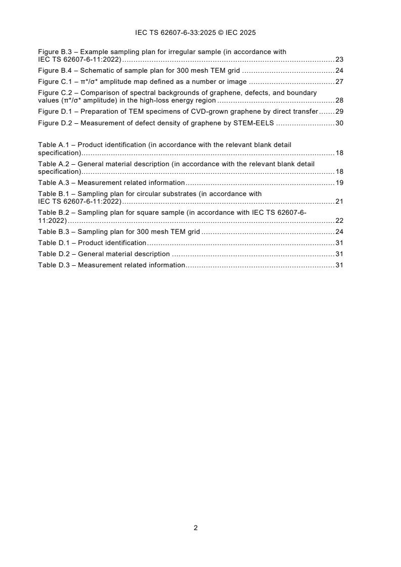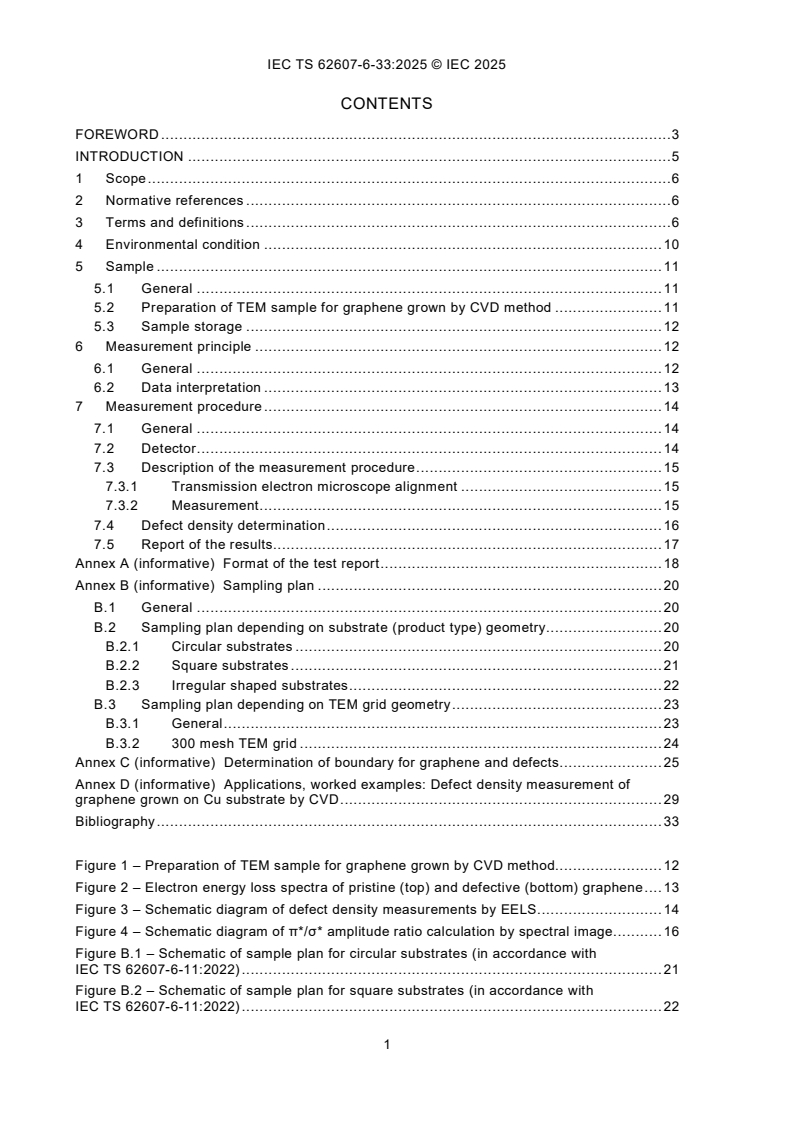 IEC TS 62607-6-33:2025, which is a Technical Specification, establishes a standardized method to determine the key control characteristic • defect density (%, nm2) of single layer graphene films by • electron energy loss spectroscopy (EELS in transmission electron microscopy (TEM)). This document outlines a method for quantitative measurement of defects in graphene at the nanoscale. The method specified in this document is applicable to single layer graphene acquired via chemical vapour deposition (CVD), roll-to-roll production and exfoliated graphene flakes to estimate the defect density. In order to obtain reliable data, it is essential that the procedure is consistent for each specified condition from the preparation of the TEM specimen to its observation. It is essential to maintain the spatial resolution below 1 nm by alignment of the beam. The dispersion value, which covers the entire energy loss near edge structure (ELNES) region of the carbon-K edge and maintains the highest energy resolution corresponds to 0,1 eV/ch. Defects in graphene are determined by measuring the spectral differences between sp2 hybridized and sp2/sp3 hybridized atoms, which are obtained by calculating the amplitude ratio of the π* and σ* orbital spectra.