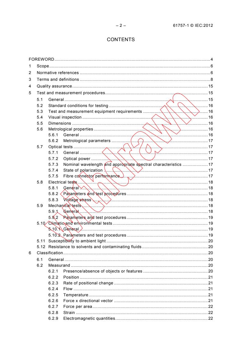 IEC 61757-1:2012 is a standard published by the International Electrotechnical Commission (IEC). Its full title is "Fibre optic sensors - Part 1: Generic specification". This standard covers: IEC 61757-1:2012 is a generic specification covering optical fibres, components and sub-assemblies as they pertain specifically to fibre optic sensing applications. It has been designed to be used as a common working and discussion tool by the vendor of components and subassemblies intended to be integrated in fibre optic sensors, as well as by designers, manufacturers and users of fibre optic sensors independent of any application or installation. The objective of this generic specification is to define, classify and provide the framework for specifying fibre optic sensors, and their specific components and subassemblies. The requirements of this standard apply to all related sectional, family, and detail specifications. Sectional specifications will contain requirements specific to sensors for particular quantities subject to measurement. Within each sectional specification, family and detail specifications contain requirements for a particular style or variant of a fibre optic sensor of that sectional specification. This edition includes a substantial technical update of all clauses, definitions, and cited references with respect to the previous edition.