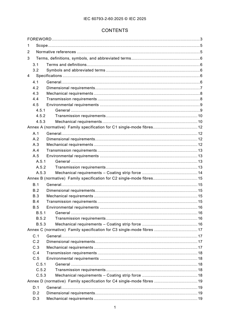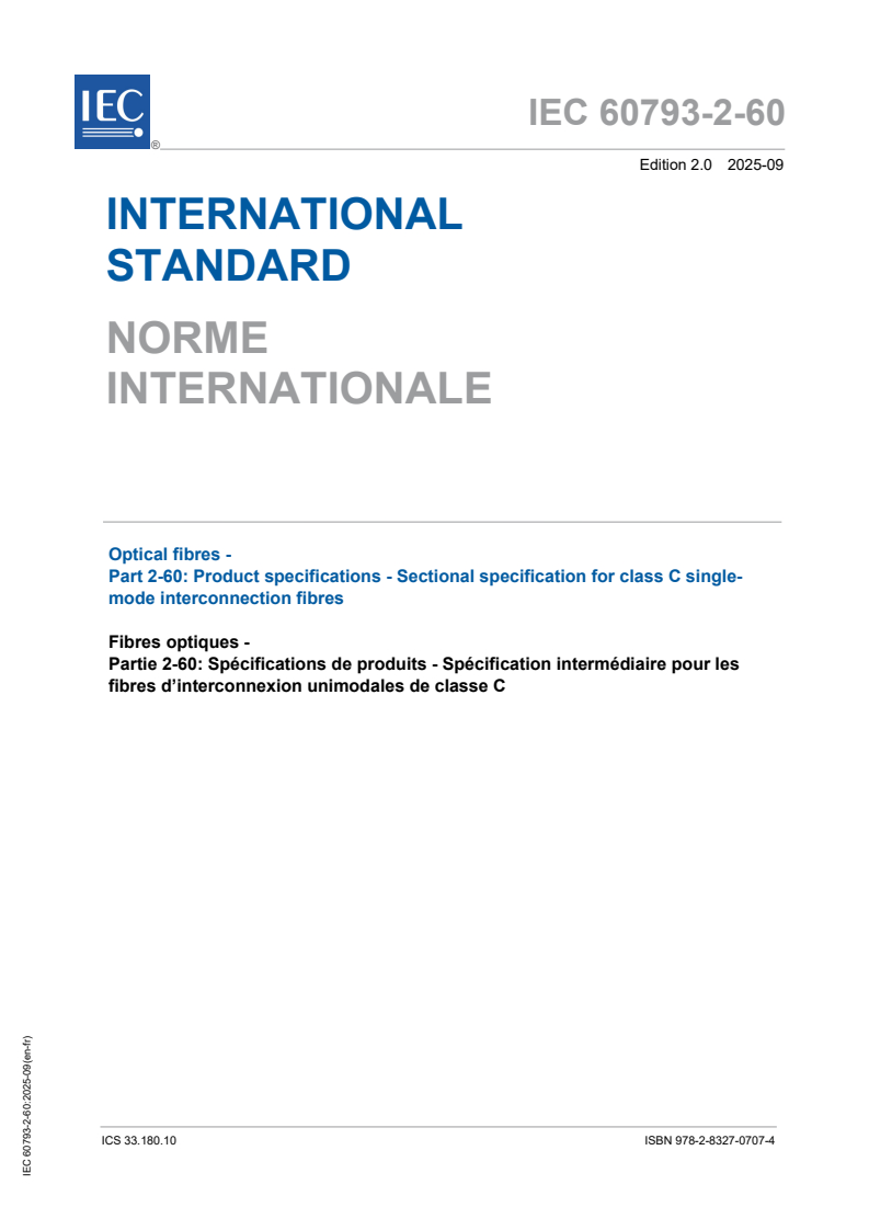 IEC 60793-2-60:2025 - Optical fibres - Part 2-60: Product specifications - Sectional specification for class C single-mode interconnection fibres Released:9/29/2025 Isbn:9782832707074