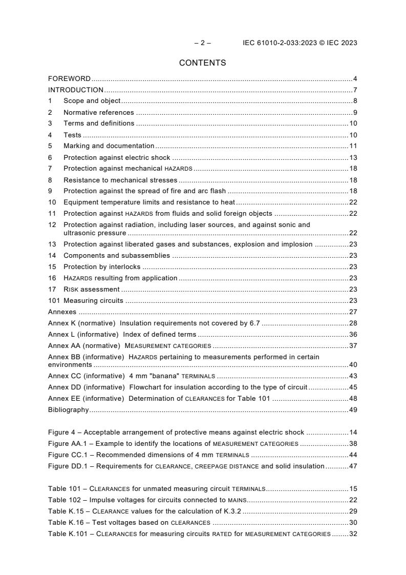 IEC 61010-2-033:2023 is a standard published by the International Electrotechnical Commission (IEC). Its full title is "Safety requirements for electrical equipment for measurement, control, and laboratory use - Part 2-033: Particular requirements for hand-held multimeters and other meters for domestic and professional use, capable of measuring mains voltage". This standard covers: IEC 61010-2-033:2023 specifies safety requirements for hand-held multimeters and other meters for domestic and professional use, capable of measuring mains. Hand-held multimeters are multi-range multifunction measuring instruments intended to measure voltage and other electrical quantities such as resistance or current. Their primary purpose is to measure voltage on a live mains. They are suitable to be supported by one hand during normal use. This third edition cancels and replaces the second edition published in 2019. This edition constitutes a technical revision. This edition includes the following significant technical changes with respect to the previous edition: a) Clause 2, all normative references have been dated and new normative references have been added; b) 4.4.2.101 is a new subclause about surge protective devices; c) Subclause 6.6.101 modifies 6.6.101 and 6.6.102 of previous edition: 1) in 6.6.101.1, insulating material of group I may be allowed for determination of creepage distances of measuring circuit terminals; 2) in 6.6.101.2, Clearances and creepage distances up to 3 000 V for measuring circuit terminals in unmated position have been defined; 3) in 6.6.101.3, requirements for measuring circuit terminals in partially mated position have been specified; 4) in 6.6.101.4, requirements for measuring circuit terminals in mated position have been specified; 5) Subclause 6.6.101.5 replaces 6.6.102; d) Subclause 6.101 replaces 6.9.101 of the previous edition with modifications; e) 9.101 is a new subclause to consider the protection of measuring circuits against the spread of fire and arc flash; f) in 9.101.2, relocation of 101.3 of previous edition; g) in 9.101.3, relocation of 101.4 of previous edition; h) in 101.3, relocation of Clause 102 of previous edition; i) in K.2.1, another method for determination of clearances of secondary circuits is proposed; j) in K.3.2, new Table K.15 and Table K.16 for clearance calculation; k) Clause K.4 of the previous edition has been deleted; l) Subclause K.101.4 has been reviewed; m) Table K.104 of the previous edition has been deleted; n) Annex AA: Figure AA.1 has been redesigned; o) Annex EE: addition of a new informative annex for determination of clearances for the purposes of Table 101.