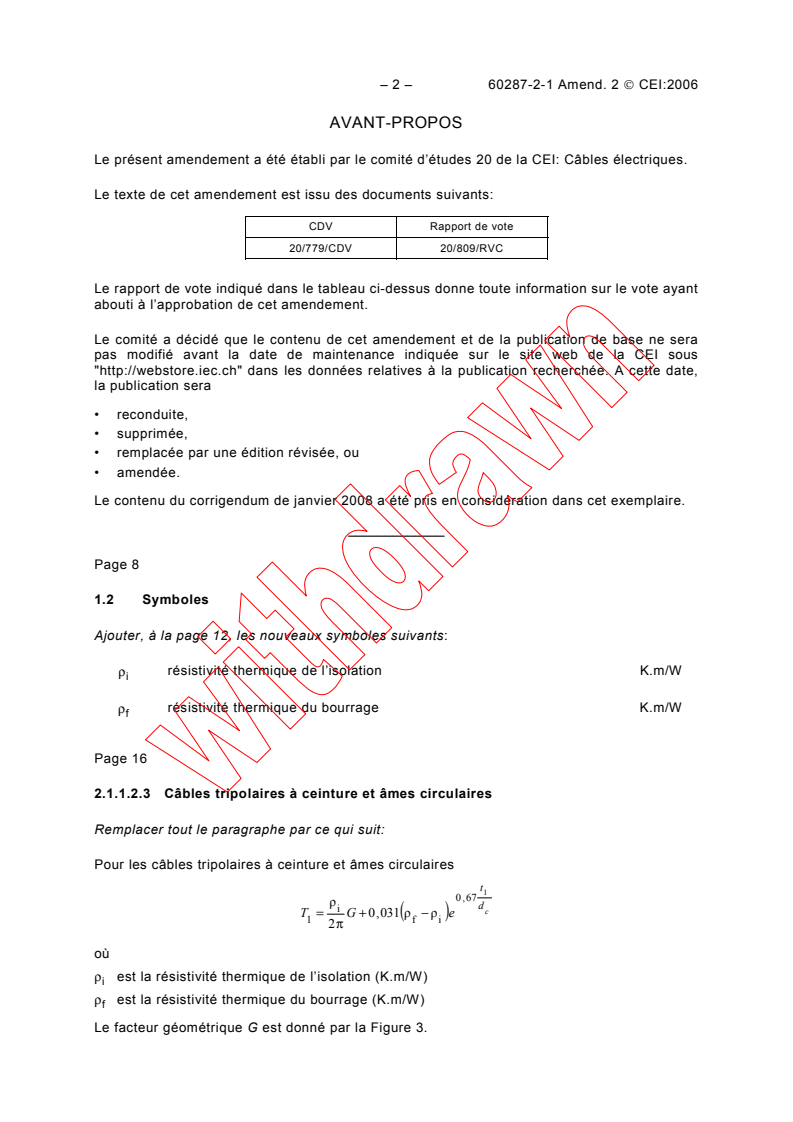 IEC 60287-2-1:1994/AMD2:2006 is a standard published by the International Electrotechnical Commission (IEC). Its full title is "Amendment 2 - Electric cables - Calculation of the current rating - Part 2-1: Thermal resistance - Calculation of thermal resistance". This standard covers: The contents of the corrigendum of January 2008 have been included in this copy.
