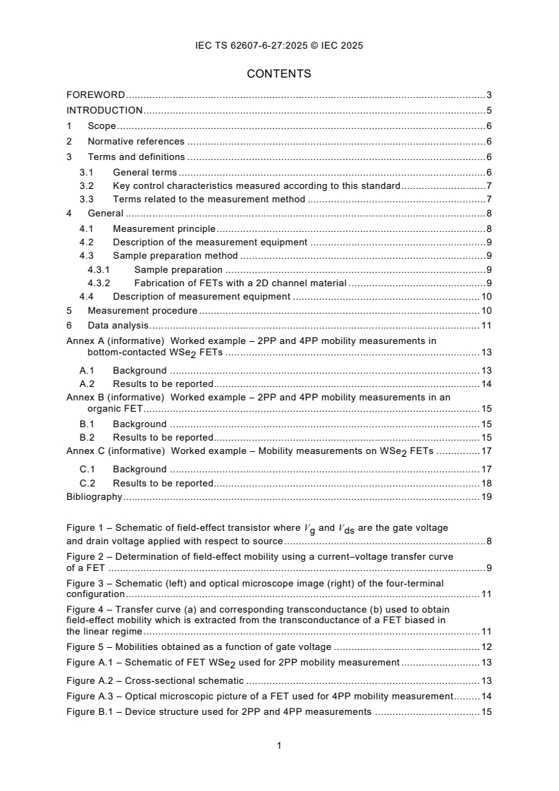 IEC TS 62607-6-27:2025, which is a Technical Specification, establishes a standardized method to determine the key control characteristic • field-effect mobility for semiconducting two-dimensional (2D) materials by the • field-effect transistor (FET) method. For two-dimensional semiconducting materials, the field-effect mobility is determined by fabricating a FET test structure and measuring the transconductance in a four-terminal configuration. - This method can be applied to layers of semiconducting two-dimensional materials, such as graphene, black phosphorus (BP), molybdenum disulfide (MoS₂), molybdenum ditelluride (MoTe₂), tungsten disulfide (WS₂), and tungsten diselenide (WSe₂). - The four-terminal configuration improves accuracy by eliminating parasitic effects from the probe contacts and cables