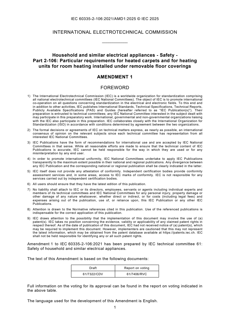 IEC 60335-2-106:2021/AMD1:2025 - Amendment 1 - Household and similar electrical appliances - Safety - Part 2-106: Particular requirements for heated carpets and for heating units for room heating installed under removable floor coverings Released:19. 06. 2025 Isbn:9782832705117