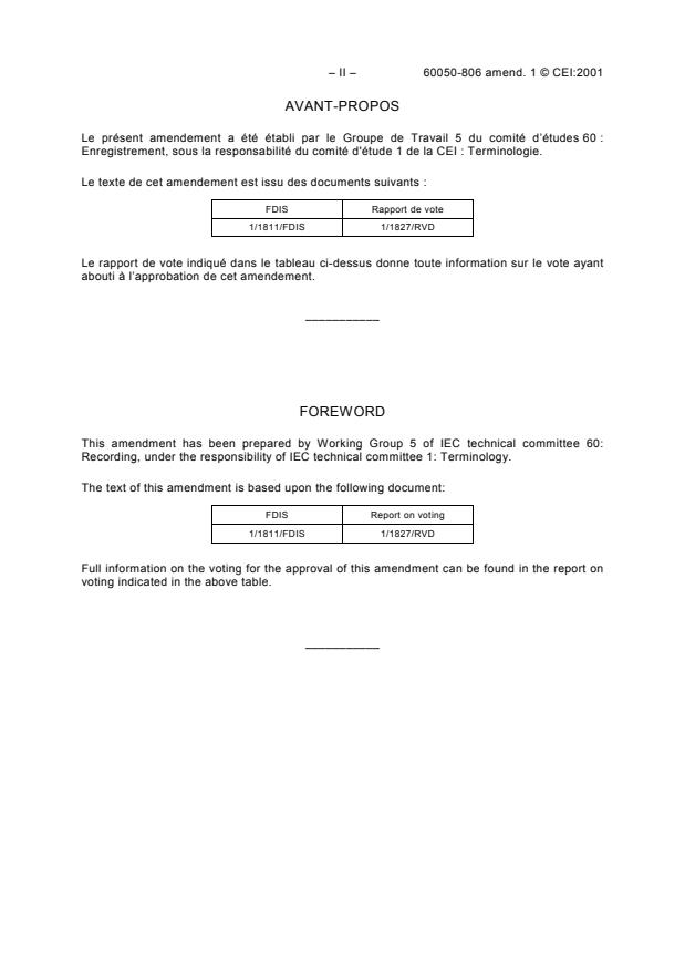 Amendement 1 - Vocabulaire Electrotechnique International (IEV) - Partie 806: Enregistrement et lecture du son et des images