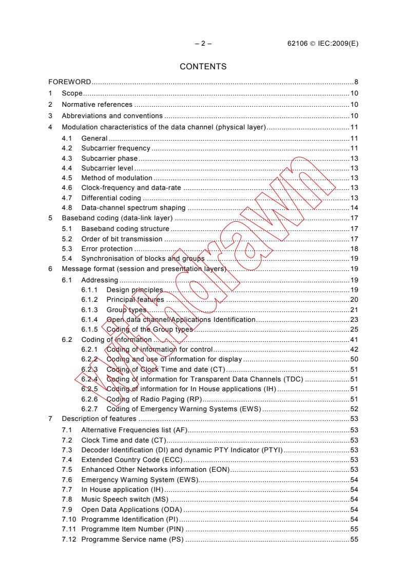 IEC 62106:2009 is a standard published by the International Electrotechnical Commission (IEC). Its full title is "Specification of the Radio Data System (RDS) for VHF/FM sound broadcasting in the frequency range from 87,5 MHz to 108,0 MHz". This standard covers: IEC 62106:2009(E) describes the Radio Data System, RDS, intended for application to VHF/FM sound broadcasts in the range 87,5 MHz to 108,0 MHz which may carry either stereophonic (pilot-tone system) or monophonic programmes. The main objectives of RDS are to enable improved functionality for FM receivers and to make them more user-friendly by using features such as Programme Identification, Programme Service name display and where applicable, automatic tuning for portable and car radios, in particular. The relevant basic tuning and switching information therefore has to be implemented by the type 0 group (see 6.1.5.1), and it is not optional unlike many of the other possible features in RDS. This edition constitutes a technical revision. The main changes with respect to the previous edition are: - the list of RDS country codes, inclusive of the extended country codes, has been updated in Annexes D and N; - Annex E, containing the character code tables to be used in RDS has been updated; - RadioText Plus has been added as a new feature in Annex P; - Enhanced RadioText has been added as a new feature in Annex Q. The contents of the corrigendum of May 2010 have been included in this copy.
