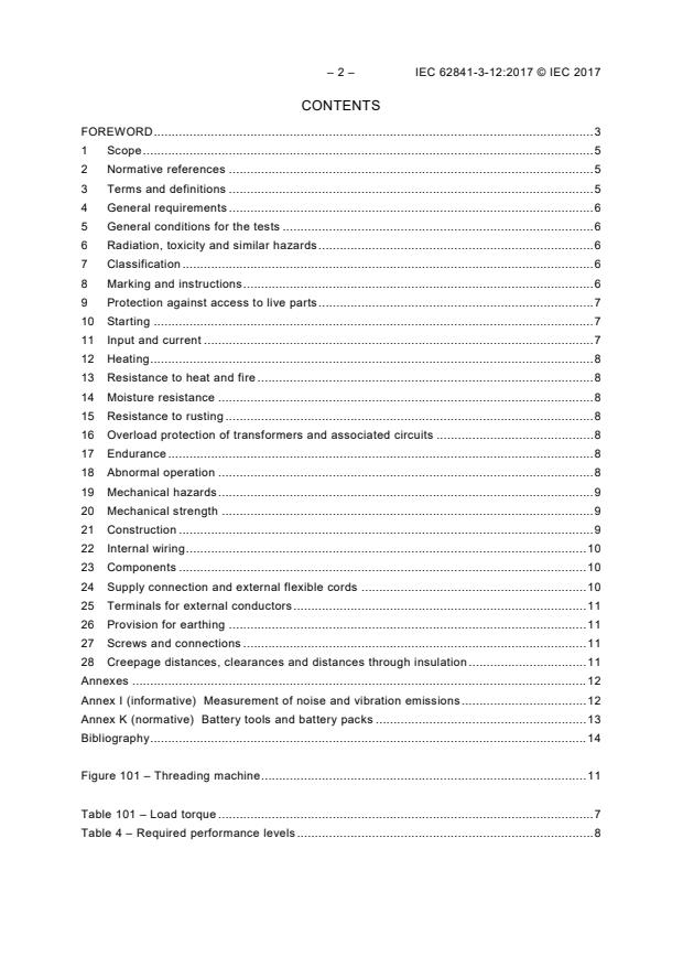 IEC 62841-3-12:2017 is a standard published by the International Electrotechnical Commission (IEC). Its full title is "Electric motor-operated hand-held tools, transportable tools and lawn and garden machinery - Safety - Part 3-12: Particular requirements for transportable threading machines". This standard covers: IEC 62841-3-12:2017 applies to transportable threading machines. The rated voltage is not more than 250 V for single-phase a.c. or d.c. tools, and 480 V for three-phase a.c. tools. The rated input is not more than 3 700 W. The limits for the applicability of this standard for battery tools are given in Annex K. This standard deals with the hazards presented by tools which are encountered by all persons in the normal use and reasonably foreseeable misuse of the tools. Hand-held electric tools, which can be mounted on a support or working stand for use as fixed tools without any alteration of the tool itself, are within the scope of this standard and such combination of a hand-held tool and a support is considered to be a transportable tool and thus covered by the relevant Part 3. This Part 3-12 is to be used in conjunction with the first edition of IEC 62841-1:2014. The attention of National Committees is drawn to the fact that equipment manufacturers and testing organizations may need a transitional period following publication of a new, amended or revised IEC publication in which to make products in accordance with the new requirements and to equip themselves for conducting new or revised tests. It is the recommendation of the committee that the content of this publication be adopted for implementation nationally not earlier than 36 months from the date of publication.