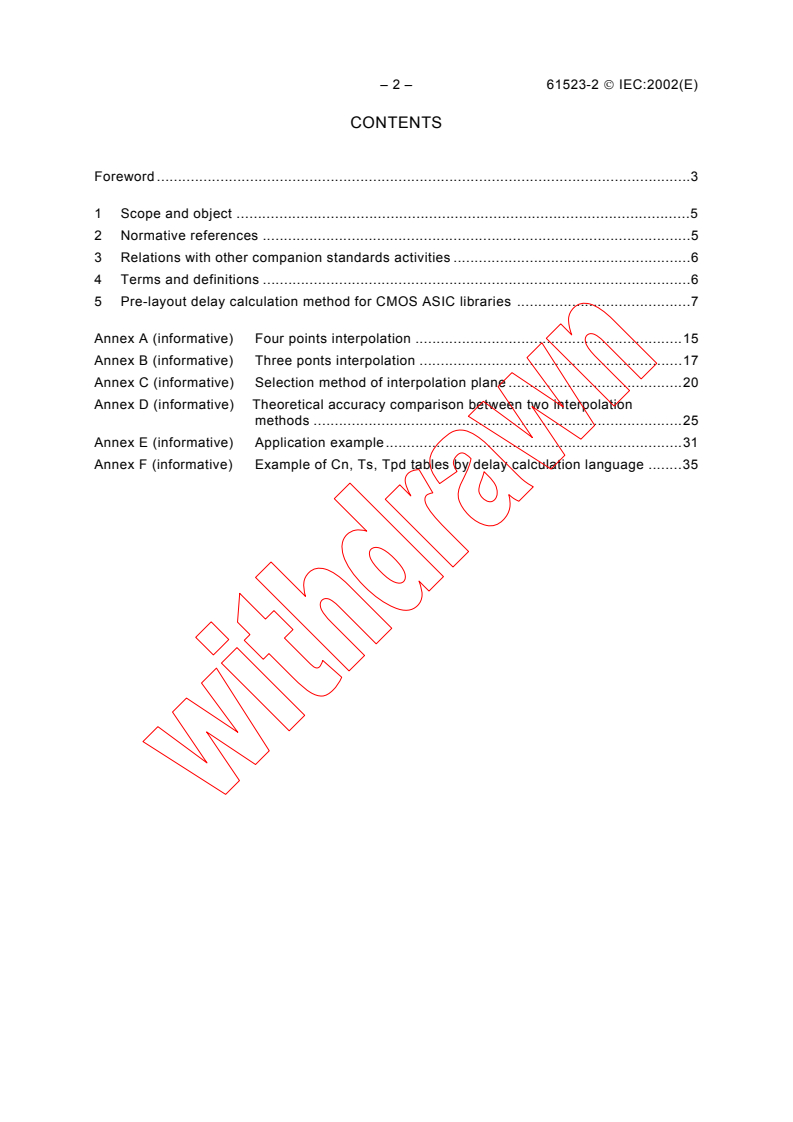 IEC 61523-2:2002 is a standard published by the International Electrotechnical Commission (IEC). Its full title is "Delay and power calculation standards - Part 2: Pre-layout delay calculation specification for CMOS ASIC libraries". This standard covers: Applies to CMOS ASIC libraries which contain cell based primitives and memories to be used during the pre-layout design phase of logic simulation, timing verification and logic synthesis.The delay calculation method addressed in this standard consists of 1) estimation of wire capacitance 2 ) Delay calculation method based on tablelook-up. With use of DCL and SDF, this delay calculation method helps the user have a unified timing model for various EDA tools in the pre-layout design phase.