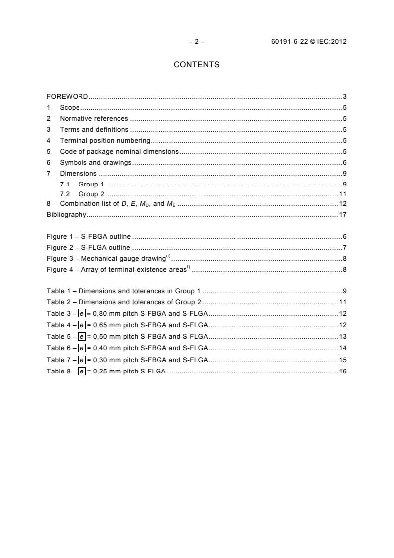 IEC 60191-6-22:2012, titled Mechanical standardization of semiconductor devices - Part 6-22: General rules for the preparation of outline drawings of surface mounted semiconductor device packages - Design guide for semiconductor packages Silicon Fine-pitch Ball Grid Array and Silicon Fine-pitch Land Grid Array (S-FBGA and S-FLGA), is an international standard published by the International Electrotechnical Commission (IEC). This standard provides detailed mechanical specifications, outline drawings, and dimensional guidelines specifically for silicon-based surface-mounted semiconductor device packages, focusing on fine-pitch Ball Grid Array (S-FBGA) and Land Grid Array (S-FLGA) packages.