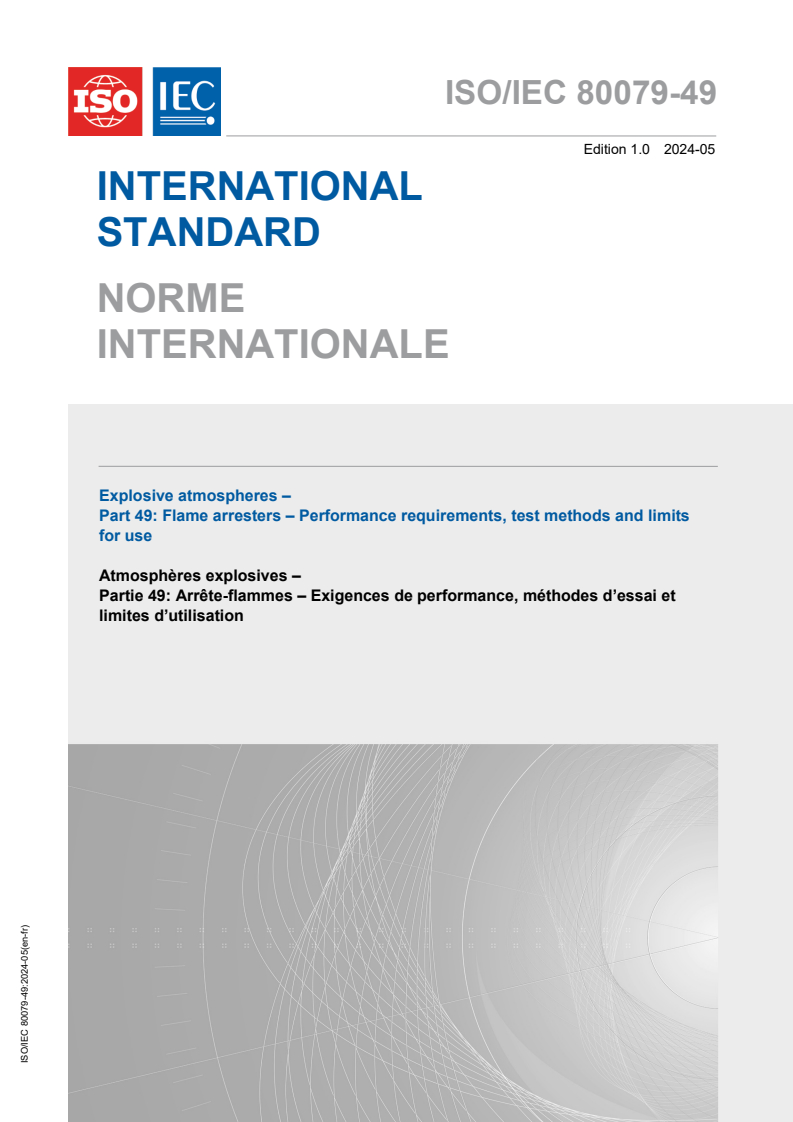 Keywords: ISO/IEC 80079-49:2024, flame arresters, explosive atmospheres, performance requirements, test methods, limits for use, deflagration, detonation, flow test, marking.