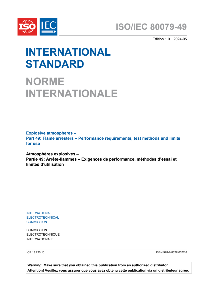 ISO/IEC 80079-49:2024 - Explosive atmospheres - Part 49: Flame arresters - Performance requirements, test methods and limits for use Released:5/3/2024 Isbn:9782832700778