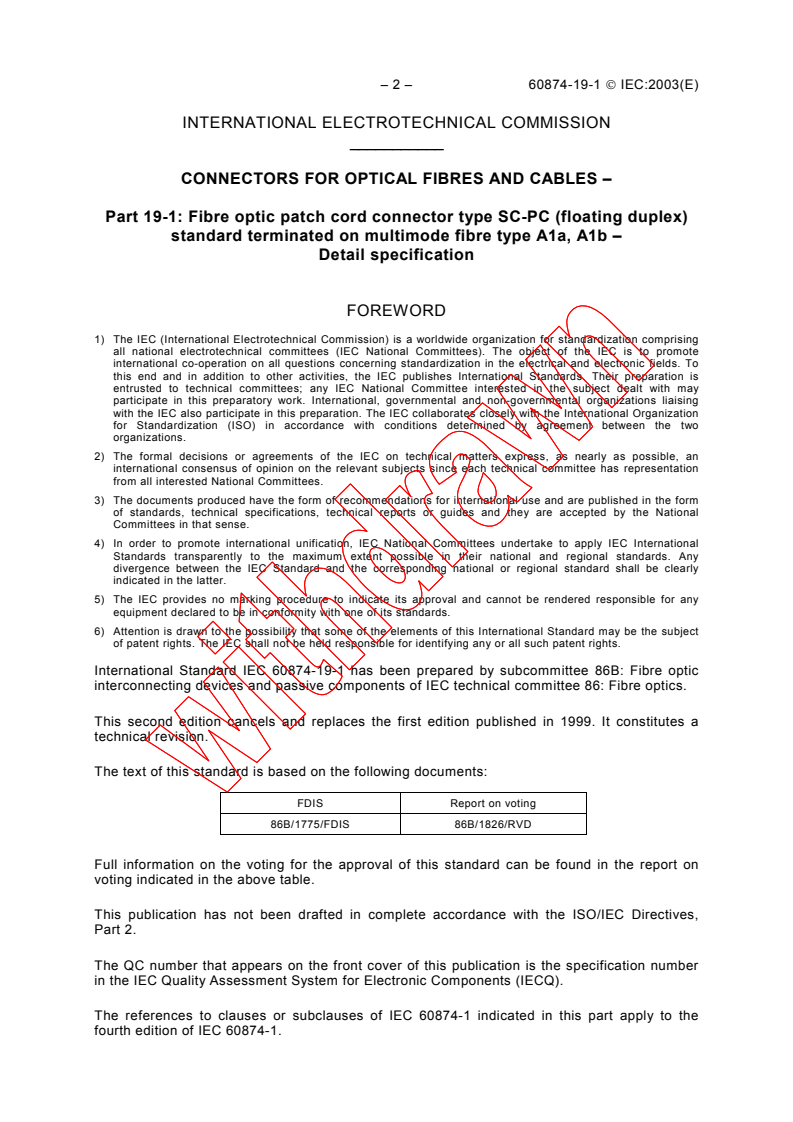 IEC 60874-19-1:2003 - Connectors for optical fibres and cables - Part 19-1: Fibre optic patch cord connector type SC-PC (floating duplex) standard terminated on multimode fibre type A1a, A1b - Detail specification Released:1/28/2003 Isbn:2831868068