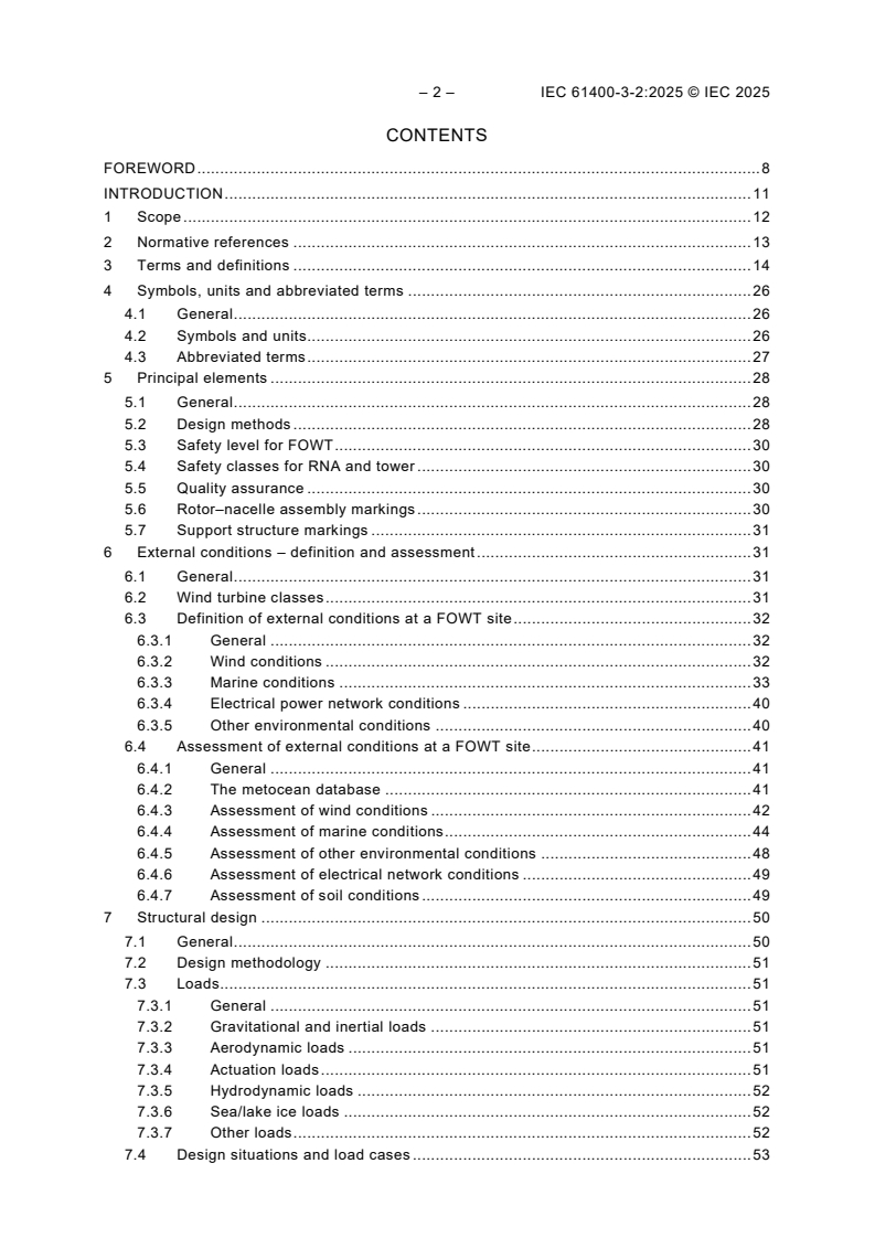 IEC 61400-3-2:2025 specifies requirements for assessment of the external conditions at a floating offshore wind turbine (FOWT) site and specifies essential design requirements to ensure the engineering integrity of FOWTs. Its purpose is to provide an appropriate level of protection against damage from all anticipated hazards during the planned lifetime.