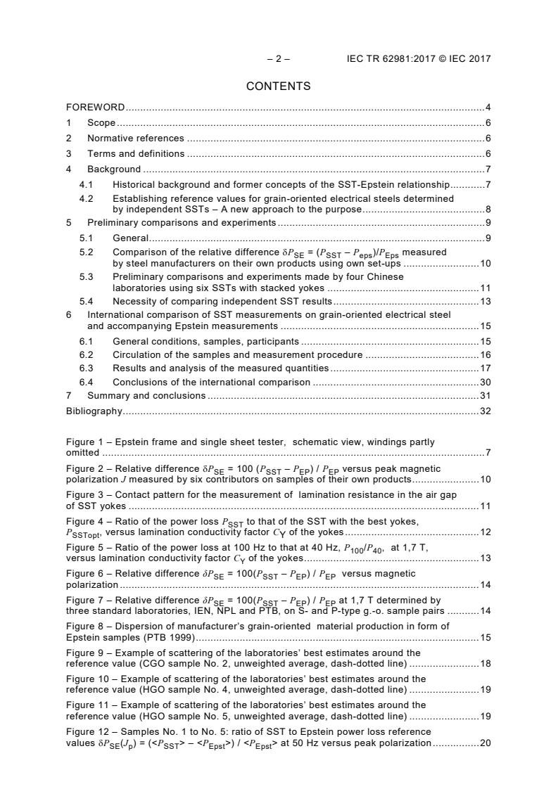 IEC TR 62981:2017 is an IEC Technical Report that documents international studies and comparisons of magnetic measurements on grain-oriented electrical steelsheet using the Single Sheet Tester (SST) method and the Epstein test method. The report presents results from inter‑laboratory exercises that characterize the statistical performance of SST measurements on high‑permeability (P‑grade) grain‑oriented (g.-o.) electrical steel and compares these with up‑to‑date Epstein test data. It also investigates systematic error sources in SSTs, notably the effect of yoke lamination insulation on measured losses.