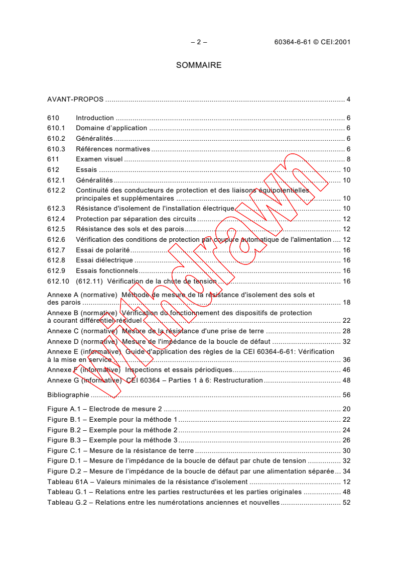 Donne des prescriptions pour la vérification, par inspection ou essais de la conformité de l'installation avec les prescriptions appropriées des autres parties de la CEI 60364. Des critères d'essais sont donnés et les essais décrits. La présente partie ne traite que d'installations neuves, elle ne traite pas de l'inspection et des essais des installations existantes. Toutefois, les critères d'inspection et les essais décrits peuvent s'appliquer, si cela est approprié, à des installations existantes.