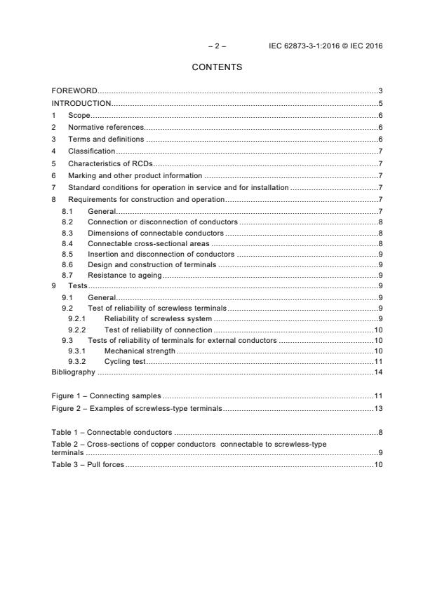 IEC 62873-3-1:2016(E) applies to RCDs equipped with screwless terminals, for current not exceeding 20 A primarily suitable for connecting unprepared (see 3.5) copper conductors of cross-section up to 4 mm2. This part of IEC 62873 cannot be used alone but it is intended to be applied together with an RCD product standard (IEC 61008-1 or IEC 61009-1) if an RCD is equipped with screwless terminals.