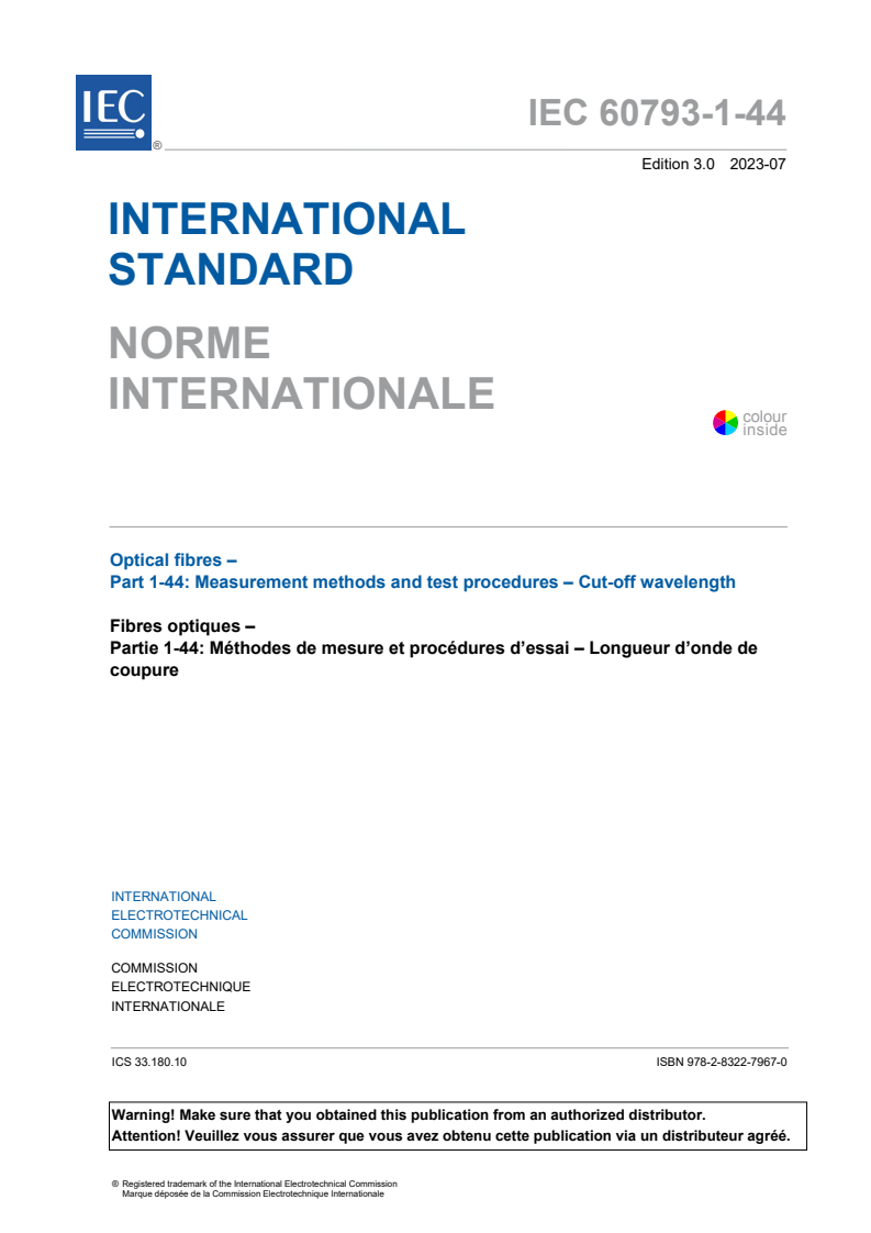 IEC 60793-1-44:2023 - Optical fibres - Part 1-44: Measurement methods and test procedures - Cut-off wavelength Released:7/24/2023 Isbn:9782832270332