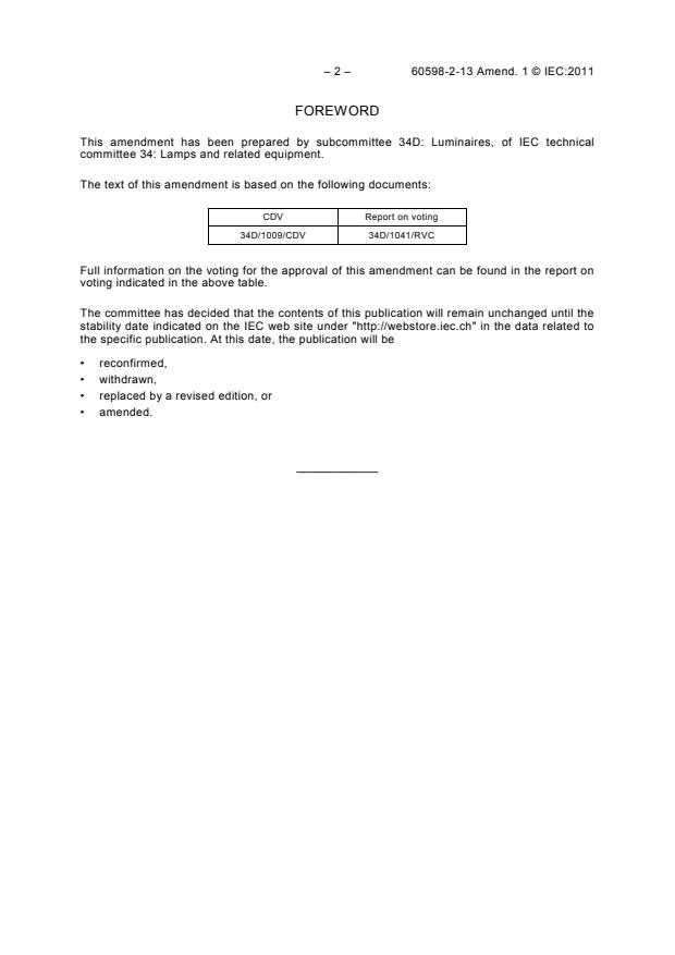 IEC 60598-2-13:2006/AMD1:2011 has the following relationships with other standards: It is inter standard links to IEC 60598-2-13:2006. Understanding these relationships helps ensure you are using the most current and applicable version of the standard.