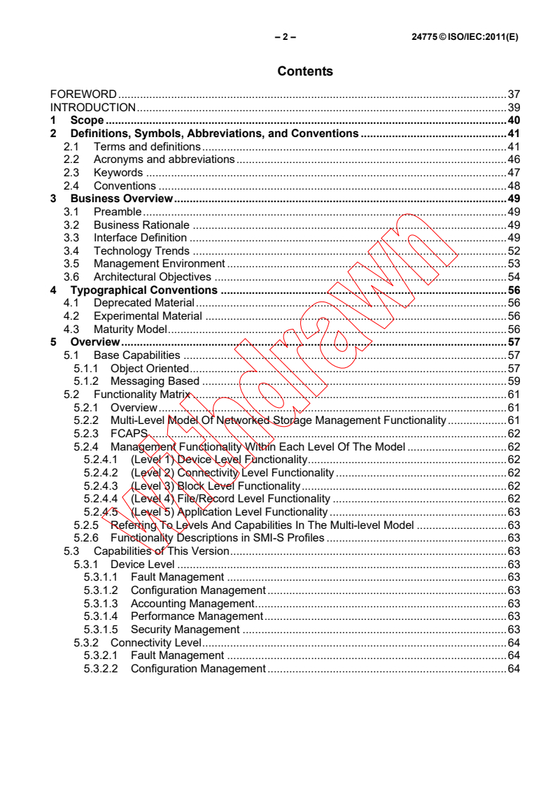 ISO/IEC 24775:2011(E) defines an interface for the secure, extensible, and interoperable management of a distributed and heterogeneous storage system. This interface uses an object-oriented, XML-based, messagingbased protocol designed to support the specific requirements of managing devices and subsystems in this storage environment. Using this protocol, this International Standard describes the information available to a WBEM Client from an SMI-S compliant CIM WBEM Server. This second edition cancels and replaces the first edition published in 2007 and constitutes a technical. This edition includes the following significant changes with respect to the previous edition: - Expanded scope: The range of SAN components modeled by the profiles defined in this specification has been greatly expanded. Many of the profiles that were identified as either future work or experimental content at the time of the initial publication have matured to full profiles. In addition, new areas have been modelled and included (e.g., SCSI Target Ports). - Improved organization: The specification has been reorganized to provide more information more easily. The experimental content has been incorporated into the body of the document, rather than being segregated in an annex, to ease planning for adoption of emerging techniques. - Additional documentation of best practices and deployment concerns: The specification now includes a more formal representation of common deployment and usage practices, a more complete treatment of backward compatibility issues and a more detailed discussion of the capabilities of the API, grouping them into a five-level architecture, spanning from physical devices to application-level manipulation, and addressing error conditions, configuration, accounting performance and security issues at each level.