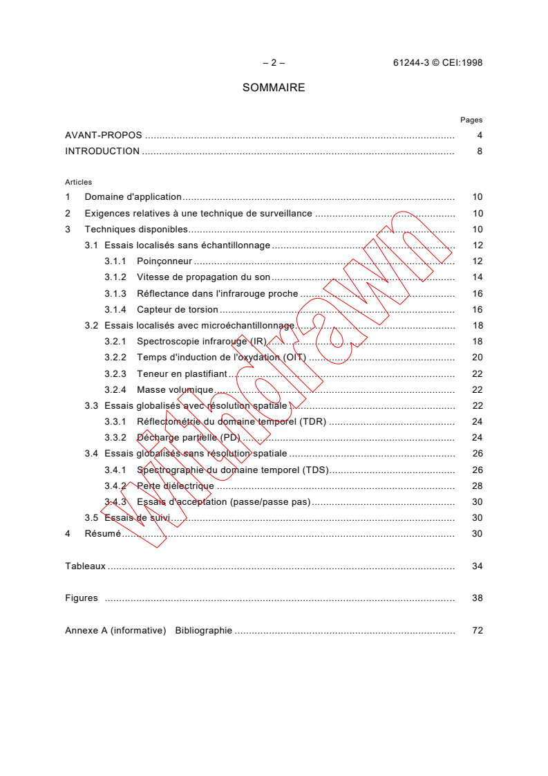 IEC TS 61244-3:1998 is a technical specification published by the International Electrotechnical Commission (IEC). Its full title is "Long-term radiation ageing in polymers - Part 3: Procedures for in-service monitoring of low-voltage cable materials". This standard covers: Summarizes the main cable monitoring techniques which are currently being assessed worldwide. These techniques are primarily aimed at monitoring degradation of low-voltage cables. Most of the methods are at the development stage and require in-plant evaluation before they could be recommended as standard techniques. The advantages and disadvantages of each method, and its current state of development, are outlined in the following sections. There are two aspects of cable monitoring that need to be taken into account - techniques suitable for ageing evaluation and techniques suitable for monitoring faults in cables. The methods discussed may, in some cases, be more suitable for monitoring faults than for evaluating the degree of degradatin of the cable materials.