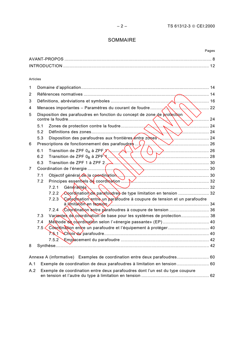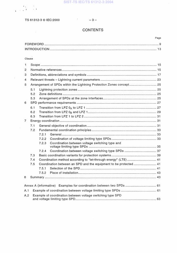 IEC TS 61312-3:2000 is a technical specification published by the International Electrotechnical Commission (IEC). Its full title is "Protection against lightning electromagnetic impulse - Part 3: Requirements of surge protective devices (SPDs)". This standard covers: Deals with the requirements of Surge Protective Devices (SPDs) standardized by IEC 61643-1. These SPDs are installed according to the Lightning Protection Zones concept given by IEC 61312-1. First, starting from primary relevant threats, gives instructions for the determination of the stress for individual SPDs. For SPDs installed within a complex system, it is admissible to divide the system into simple basic arrangements, observing the rules described. When the values and directions of the partial lightining currents flowing within the system are known, the appropriate SPDs can be selected. Also deals with basic questions of the energy coordination of SPDs among each other and between SPDs and the threat at the respective place of installation are to be considered for effective coordination. The proof of the coordination of SPDs installed in a system, is described briefly.