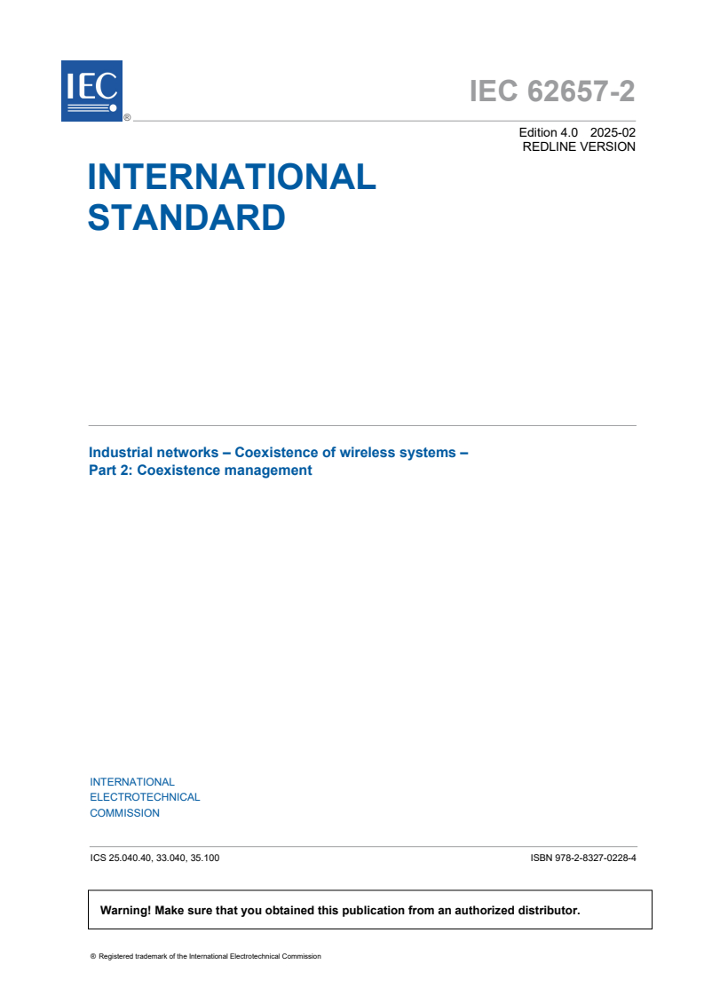 REDLINE IEC 62657-2:2025 RLV - Industrial networks - Coexistence of wireless systems - Part 2: Coexistence management Released:2/14/2025 Isbn:9782832702284