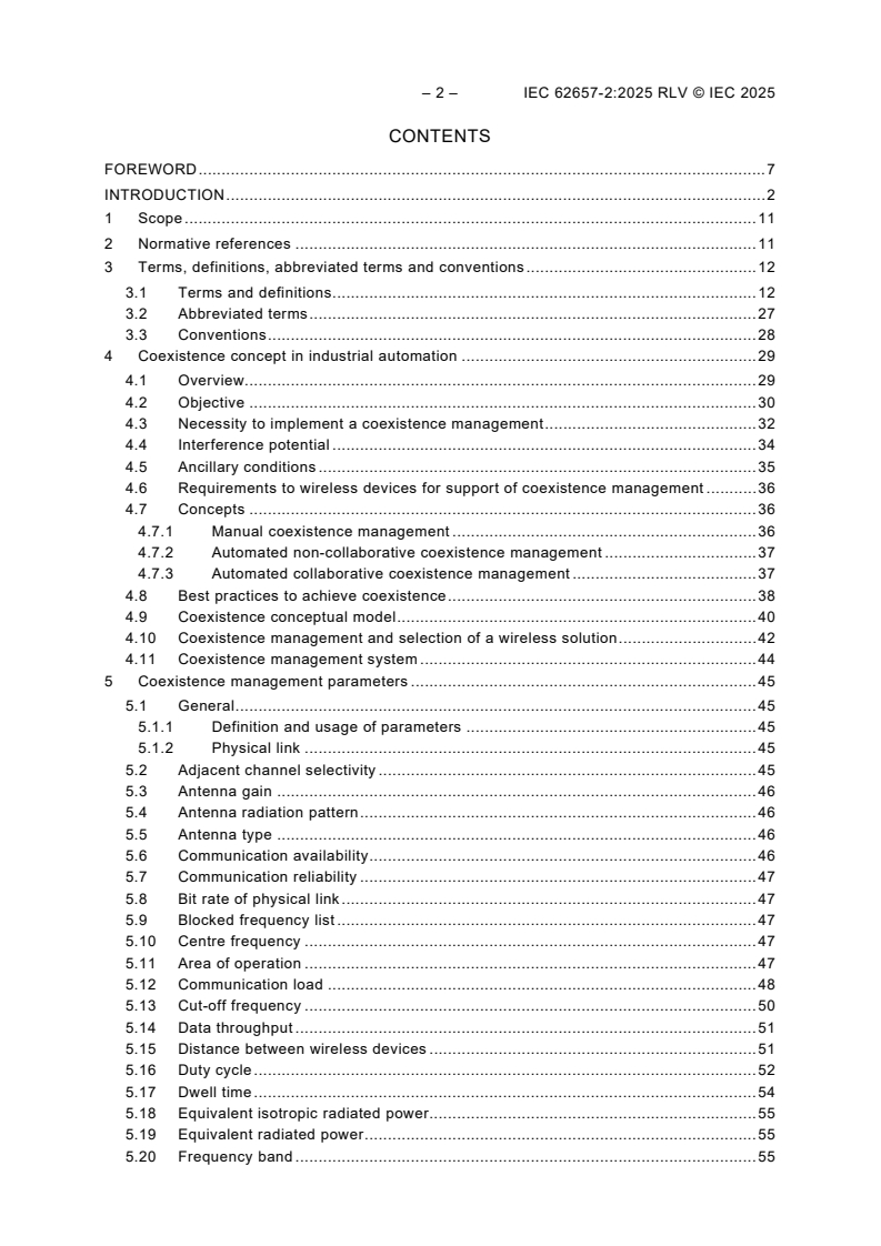 IEC 62657-2:2025 specifies: – the fundamental assumptions, concepts, parameters, and procedures for wireless communication coexistence; – specifies coexistence parameters and how they are used in an application requiring wireless coexistence; – provides guidelines, requirements, and best practices for wireless communication's availability and performance in an industrial automation plant; it covers the life‑cycle of wireless communication coexistence; – helps the work of all persons involved with the relevant responsibilities to cope with the critical aspects at each phase of life-cycle of the wireless communication coexistence management in an industrial automation plant. Life-cycle aspects include: planning, design, installation, implementation, operation, maintenance, administration and training; – provides a common point of reference for wireless communication coexistence for industrial automation sites as a homogeneous guideline to help the users assess and gauge their plant efforts; – deals with the operational aspects of wireless communication coexistence regarding both the static human/tool-organization and the dynamic network self-organization. This document provides a major contribution to national and regional regulations by supporting to fulfil the requirements using coexistence management. This edition includes the following significant technical changes with respect to the previous edition: a) alignment of some definitions and specifications of coexistence parameters in order to facilitate their future inclusion in the IEC Common Data Dictionary (IEC CDD) maintained by the IEC; b) alignment of some definitions and specifications to be consistent with the new IEC 62657-3 and IEC 62657-4; c) edition 3 of this document was published in June 2022. Some comments were made in the last development stages of this document asking for explanations on how the parts of the IEC 62657 series were structured and how they were related to each other. Resolution of these comments was deferred until a next edition, which means this edition.