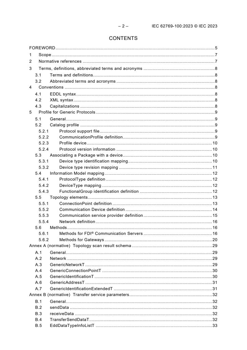 IEC 62769-100:2023 is a standard published by the International Electrotechnical Commission (IEC). Its full title is "Field device integration (FDI®) - Part 100: Profiles - Generic protocols". This standard covers: IEC 62769-100:2023 specifies an FDI®[1] profile of IEC 62769 for Generic Protocols. That means that all interfaces are defined and a host can add support for more protocols without changing its implementation. Nevertheless, there are some protocol specific definitions (PSD) that need to be specified per protocol using this profile. Annex C specifies what PSD need to be defined per protocol so that FDI® Device Packages, FDI® Communication Packages for Gateways and FDI® Communication Servers, FDI® Communication Server, Gateways and Devices supporting such a protocol can work together in a host not aware about this specific protocol.
