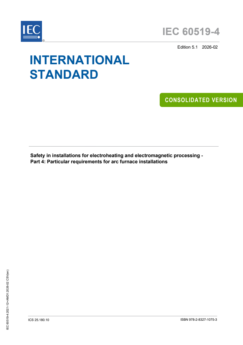 IEC 60519-4:2021+AMD1:2026 CSV - Safety in installations for electroheating and electromagnetic processing - Part 4: Particular requirements for arc furnace installations Released:2/9/2026 Isbn:9782832710753