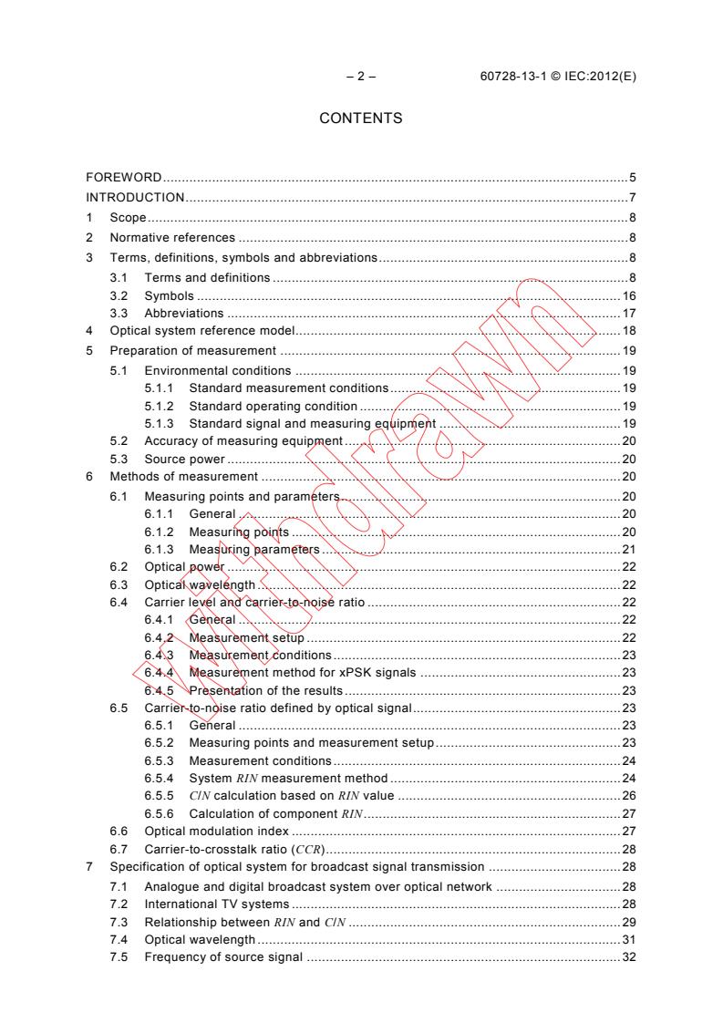 - Measurement methods and parameters: procedures for measuring optical power, optical wavelength, carrier level, carrier‑to‑noise ratio (C/N), relative intensity noise (RIN), optical modulation index and carrier‑to‑crosstalk ratio (CCR).